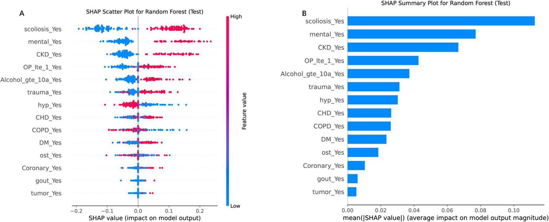 The RF model achieved superior predictive performance (test AUC = 0.88, sensitivity = 0.77, specificity = 0.87), outperforming conventional approaches. Notably, we identified scoliosis (SHAP = 0.14), mental disorders (0.12), and CKD (0.10) as the three top risk factors, with biomechanical and comorbidity interactions playing pivotal roles. DCA confirmed high clinical utility, with RF providing the greatest net benefit across risk thresholds.