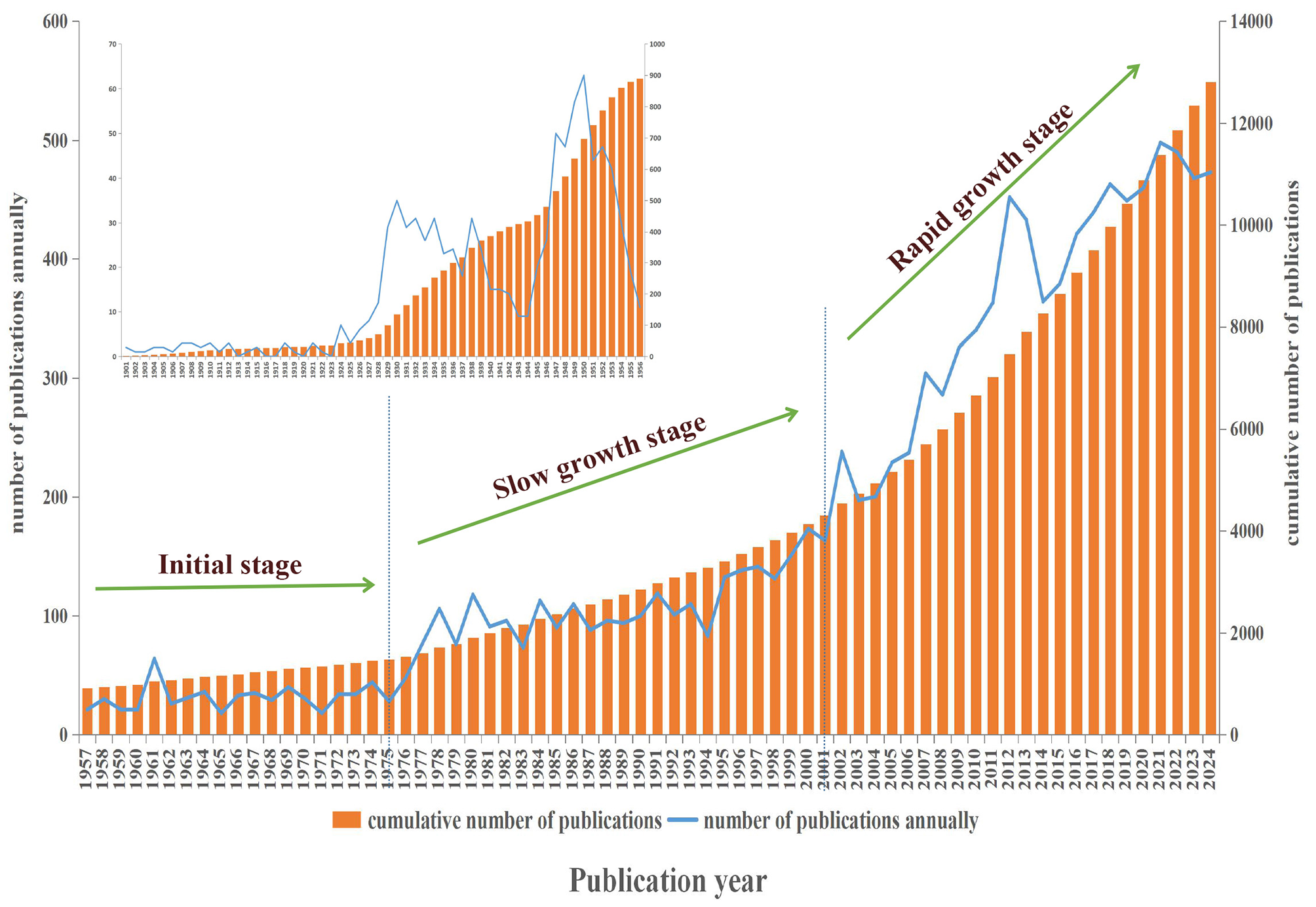 The analysis of annual publication output reveals the temporal variation in the number of literatures, facilitating the identification of research hotspots and development trends. This study included a total of 12,810 valid articles, with the earliest publication dating back to 1901. The volume of publications remained in single digits for the subsequent 27 years. Between 1928 and 1956, publication numbers exhibited significant fluctuations; however, they largely remained low, reflecting limited attention to this field during its formative years. From 1957 to 1975, the annual publication volume stabilized at a low level. Between 1976 and 2001, a consistent upward trend in publication volume emerged, indicating increasing interest in this field. After 2002, the annual publication volume increased rapidly, consistently surpassing 400 articles each year over the past 5 years, which indicates significant research progress in this field, as detailed in Figure 2.