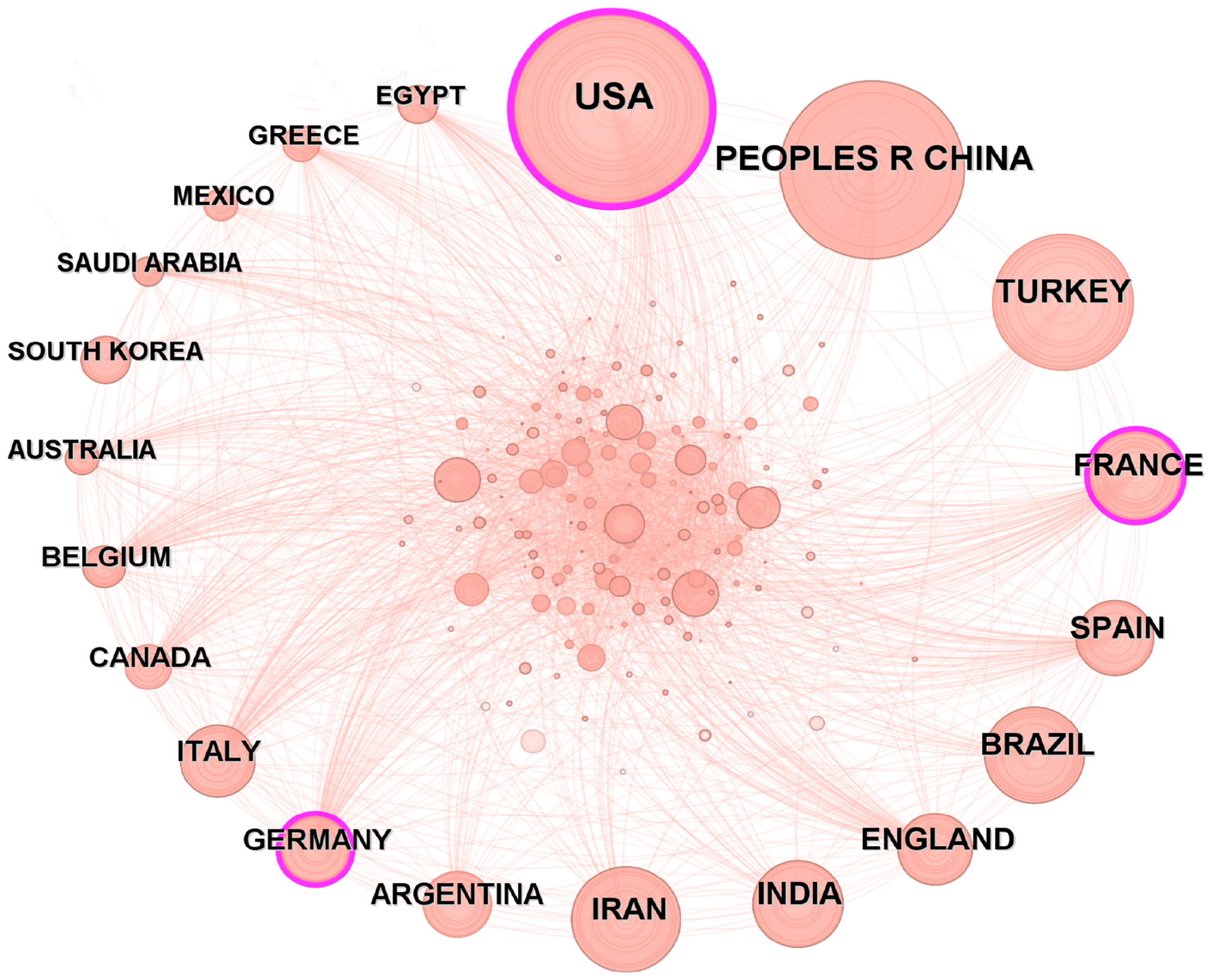 The analysis of national publication output and collaborative relationships enables a macroscopic understanding of the global development landscape in the research field, uncovers the global research pattern, identifies core cooperative networks, and provides valuable guidance for scientific research collaboration and resource allocation. Researchers from 168 countries conducted studies on brucellosis, with the United States leading at 18.51% (2,371 articles), followed by China at 8.42% (1,079 articles) and Turkey at 6.55% (839 articles). The countries with higher intermediary centrality scores include the United States (0.28), France (0.15), and Germany (0.10), while the remaining countries had centrality scores less than 0.10, as shown in Table 1. Figure 3 illustrates the collaboration among countries, with the analysis indicating that the United States maintains a prominent position in the research field of brucellosis and has close collaborations with other countries.