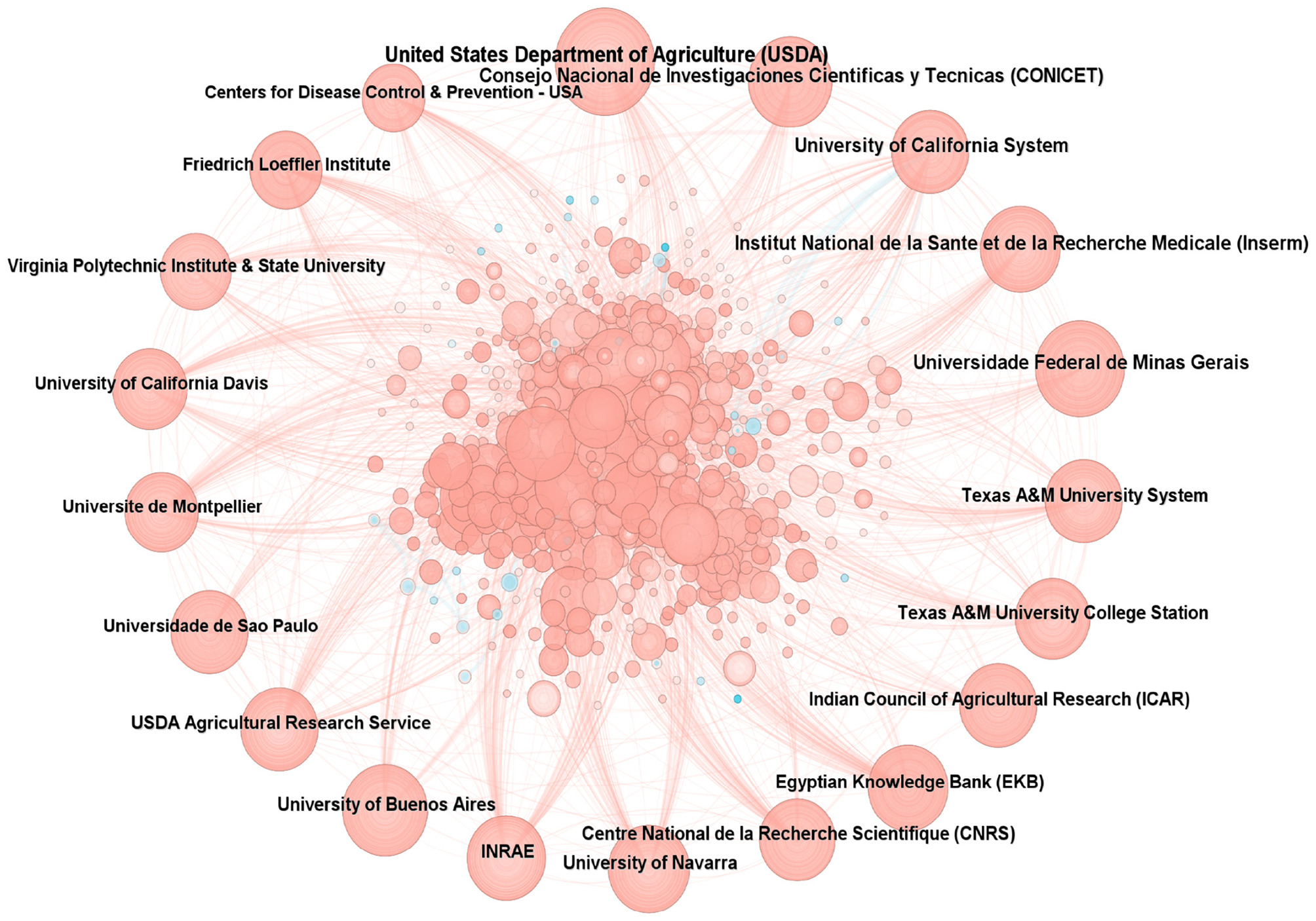 The analysis of research institutions serves as a crucial indicator for evaluating research achievements. It facilitates the rapid identification of the most active and impactful research institutions in the field, clearly illustrates the cooperation models and intensity among institutions, and sheds light on the developmental dynamics of the entire research domain. A total of 9,100 institutional researchers had engaged in studies on brucellosis, with the top three institutions by publication volume being the United States Department of Agriculture (USDA), Consejo Nacional de Investigaciones Cientificas y Tecnicas (CONICET), and the University of California System. None of the intermediary centrality scores exceeded 0.10, as shown in Figure 4, which illustrates the collaborative relationships between institutions. The results indicate that the USDA holds a significant position in the field of brucellosis research and maintains close collaborations with other institutions.