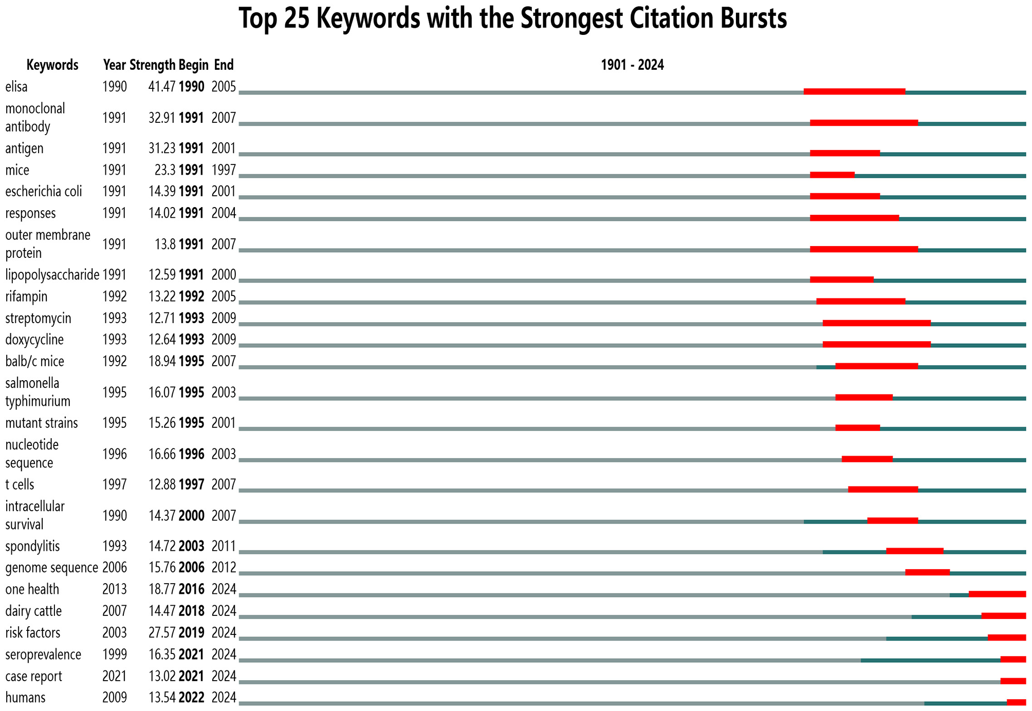 A total of 12,810 articles were included in this analysis, with the first publication dating back to 1901.The annual publication volume has increased over the years. The United States had the highest volume of publications and intermediary centrality. The United States Department of Agriculture (USDA) and the journal Infection and Immunity were found to be the most influential. Professors Kim S. and Pappas G. have made the most significant contributions to the field of brucellosis. Keyword analysis indicated that the top five high-frequency keywords were “brucella abortus,” “infection,” “brucella melitensis,” “diagnosis,” and “cattle.” Among the five formed clusters, cluster #0 (virulence) was larger and newer, with persisting research hotspots. In the keyword burst analysis, the keyword “elisa” exhibited the highest burst strength of 41.47. Recent emerging keywords include “one health,” “risk factors,” and “seroprevalence.”