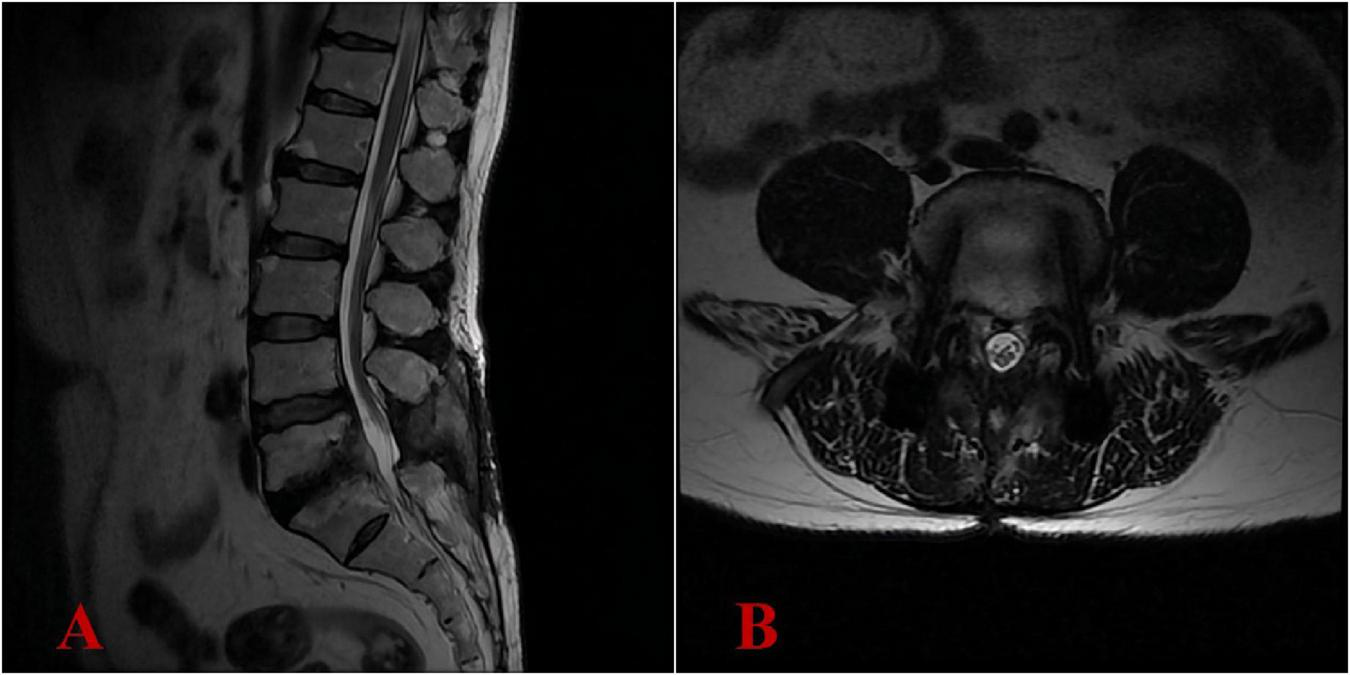 Six-month postoperative lumbar MRI demonstrated complete resolution of the intraspinal abscess, with no recurrence of infection. (A) Lateral view; (B) transverse view.