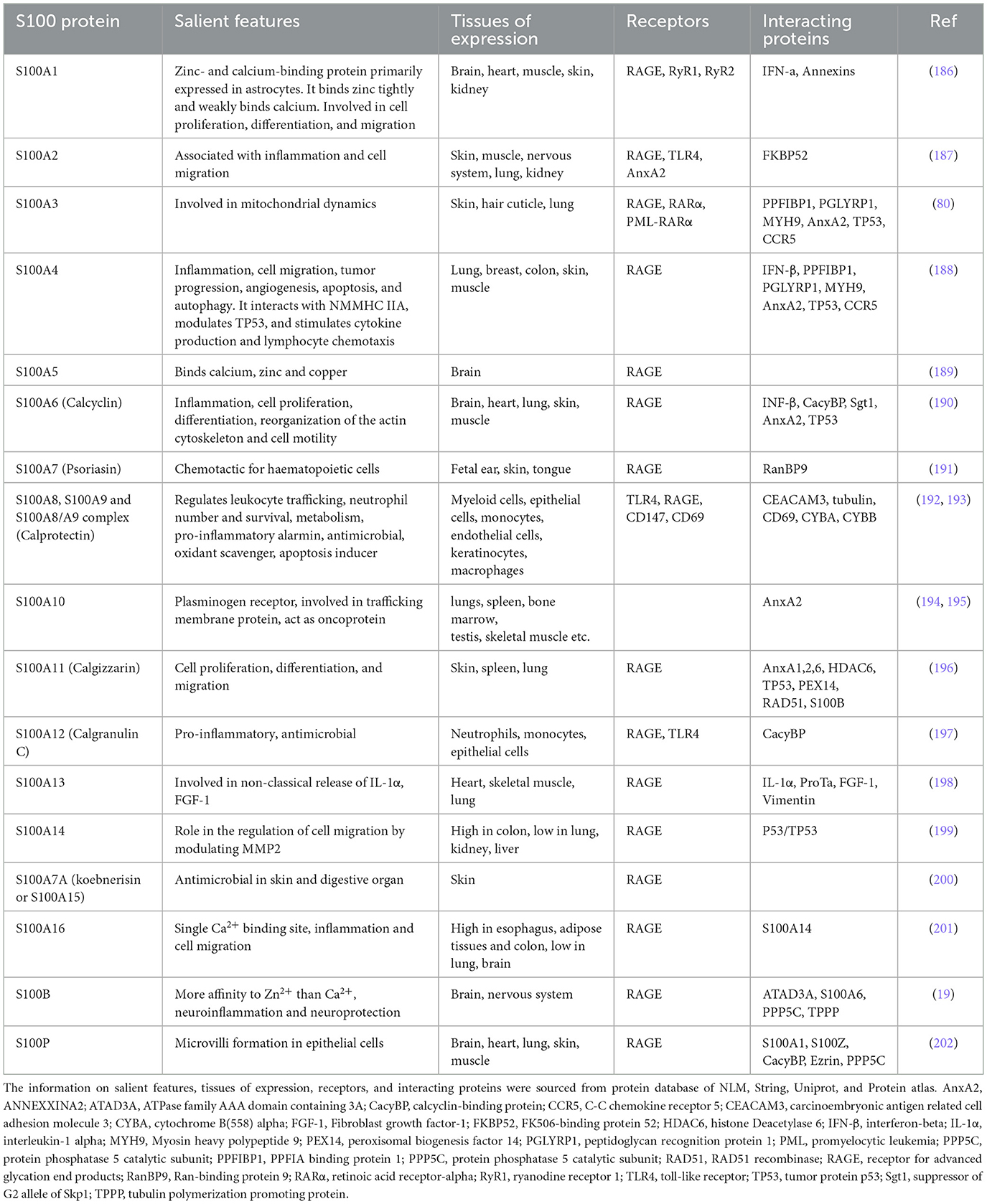 5. Donato R, Cannon BR, Sorci G, Riuzzi F, Hsu K, Weber DJ, et al. Functions of S100 proteins. Curr Mol Med. (2013) 13:24–57. doi: 10.2174/156652413804486214