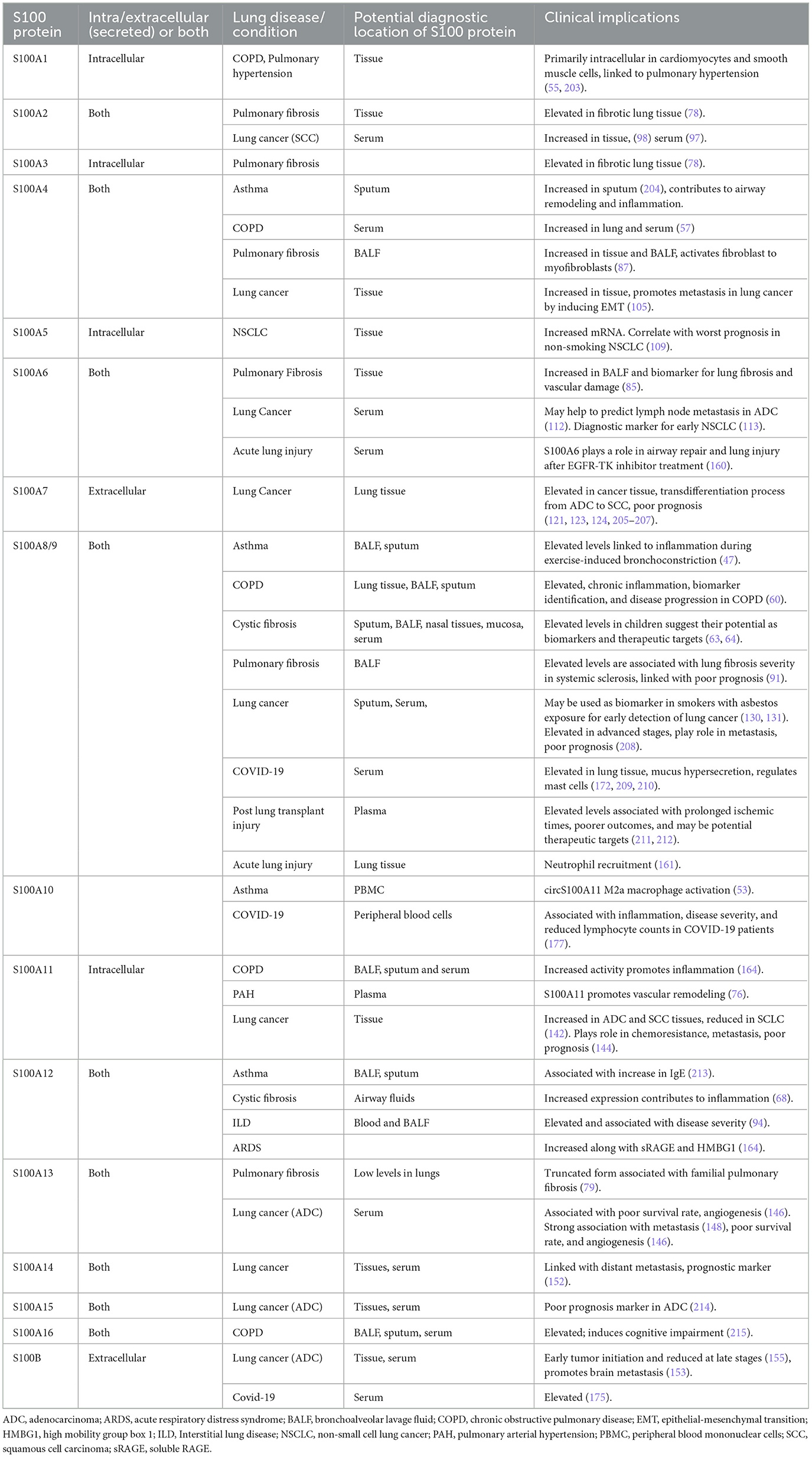 Human diseases have long been associated with the dysregulation of protein expression and functions, which play pivotal roles in maintaining cellular homeostasis (1, 2). Proteins are the driving force of signal transduction, structural maintenance, enzymatic catalysis, and immunological responses, and the perturbations in their expression levels or functional integrity because of genetic alterations, environmental influences, or other factors can result in diseases (1, 3, 4). Many protein families, like S100 family, are evolutionarily conserved to carry out the fundamental processes that maintain the physiological homeostasis of an organism (5, 6). S100 protein family, (Table 1) (7–9) comprises S100A1 to S100A16, S100B, S100G, S100P, and S100Z (10), along with S100-fused-type proteins such as trichohyalin (11), filaggrin (12), filaggrin2 (13), cornulin (14), and repetin (15) (see Table 1 for general details. We are not including S100-fused-type proteins in the table, as the relation of these proteins in lung diseases is almost null).