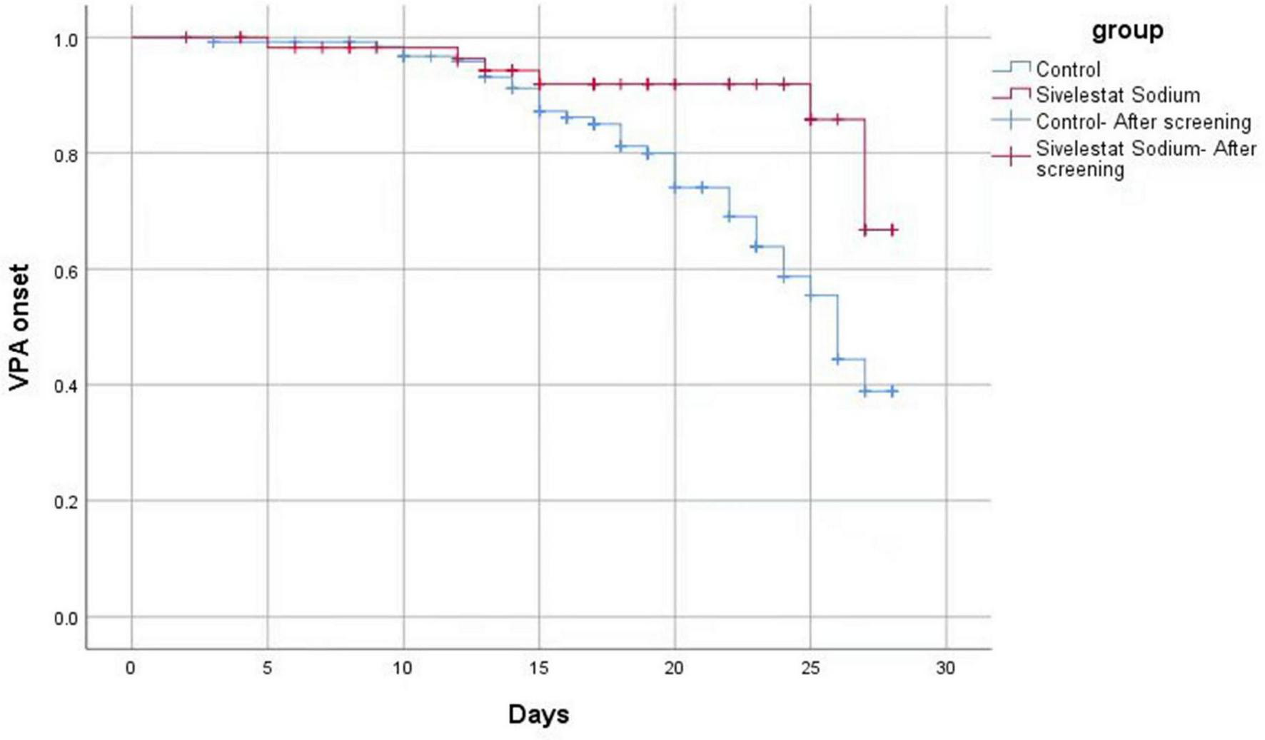 Of the 187 cases included, 62 patients died, an overall case fatality rate of 33.16%. Of the 60 cases in the sivelestat sodium group, 20 patients died, yielding a case fatality rate of 33.33%. Of the 127 cases in the control group, 44 patients died, yielding a fatality rate of 34.65%. While the 28 days fatality rate of the sivelestat sodium group did exhibit a decreasing trend (Figure 3), the difference between the two groups was not statistically significant (χ2 = 4.100, P = 0.040).