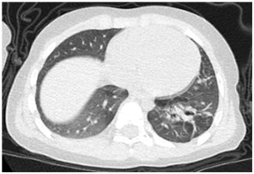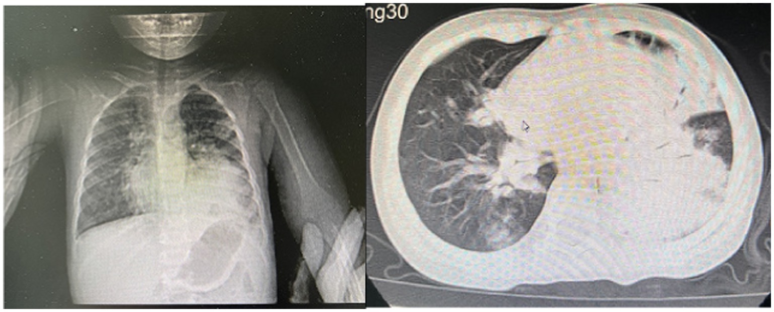 On admission, physical examination showed a heart rate of 130 beats/min, respiratory rate of 44 breaths/min, and normal blood pressure. The child was alert, with mild intercostal retractions. Auscultation revealed decreased breath sounds in the left lung, moist rales, and slight wheezing. The abdomen was soft, with the liver palpable 3 cm below the costal margin. Past medical and developmental history was unremarkable, with healthy parents and no family history of genetic disorders. The child had received routine immunizations, including Bacillus Calmette–Guérin (BCG), hepatitis B vaccine, poliomyelitis vaccine, acellular diphtheria–tetanus–pertussis vaccine (DTaP), measles–mumps–rubella (MMR) vaccine, live attenuated Japanese encephalitis vaccine, group A meningococcal polysaccharide vaccine, and live attenuated hepatitis A vaccine. The patient had not received influenza or pneumococcal vaccinations.