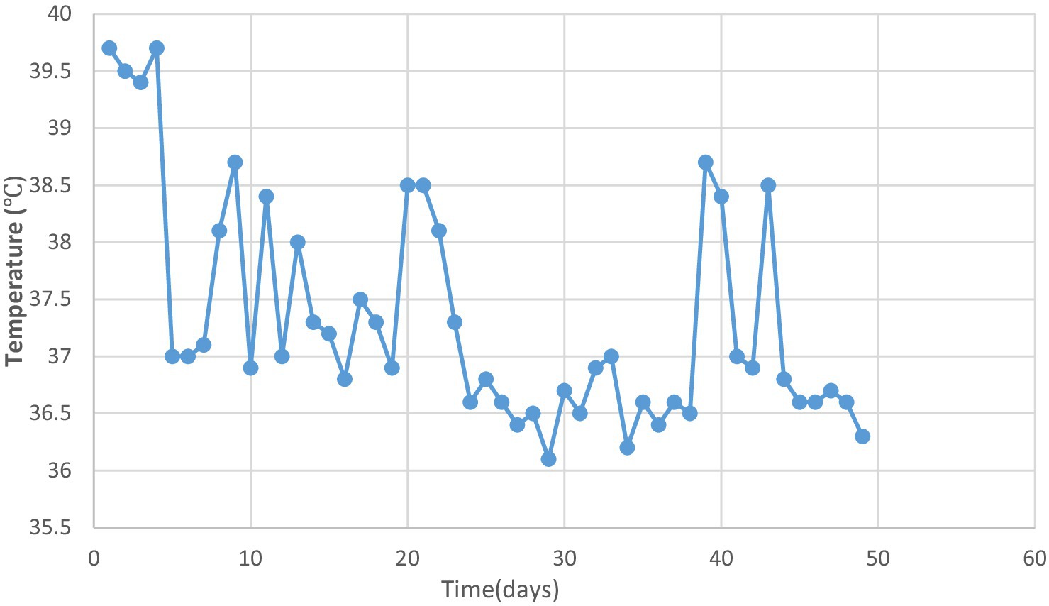 On day 9, bronchoalveolar lavage revealed congested bronchial mucosa with minimal white secretion. Microbiological testing via polymerase chain reaction (PCR) on bronchoalveolar lavage confirmed Streptococcus pneumoniae, human metapneumovirus (hMPV), and influenza A virus subtype H3N2. Serotyping for S. pneumoniae was not performed. Peramivir (10 mg/kg/day intravenously for 2 days) was added to the regimen to address influenza A (H3N2). Repeat blood tests showed WBC 19.5 × 10^9/L, NEUT 65.7% with nuclear left shift, and CRP 5.48 mg/L. Despite treatment, intermittent fever (Figure 2), cough, and shortness of breath persisted.