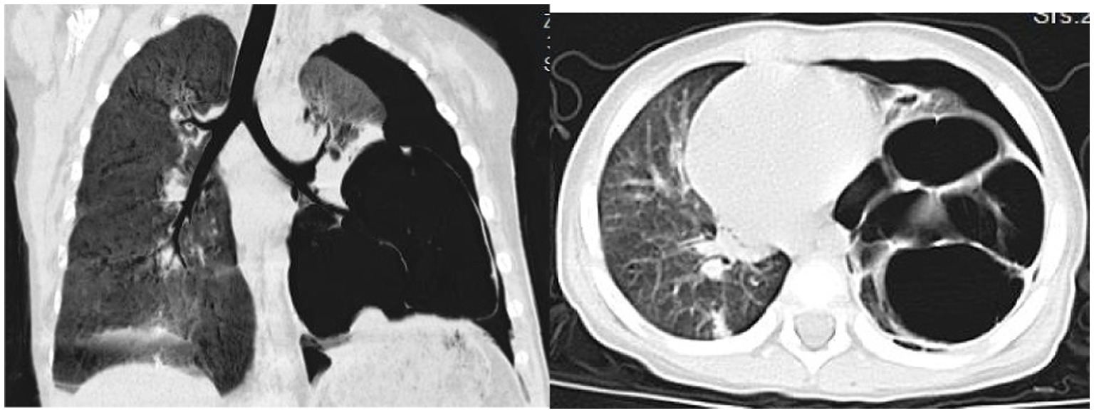 On day 32, the patient experienced worsened cough and developed respiratory distress. Chest CT (Figure 3) revealed left-sided pneumothorax with 40–50% lung compression, managed with thoracic drainage. Due to significant necrotic lung tissue and potential recurrent pneumothorax, surgical resection was advised but declined by the family. On day 41, recurrent fever prompted testing, revealing Mycoplasma pneumoniae via antigen detection on nasopharyngeal swabs using the colloidal gold method, treated with azithromycin (10 mg/kg/day intravenously for 3 days).