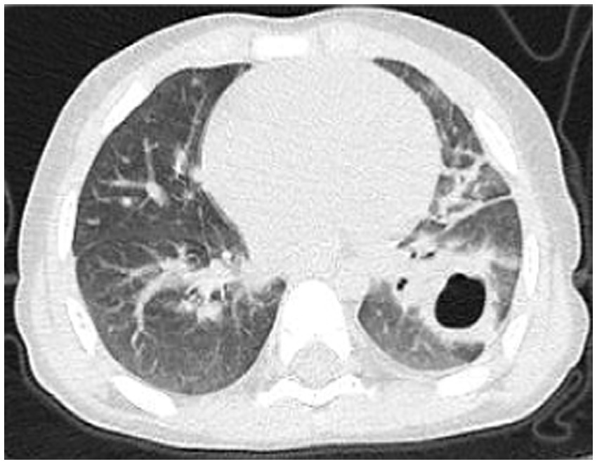 A 2-year-old male patient presented with a 7-day history of paroxysmal cough with sputum and rhinorrhea, followed by 4 days of fever (peak temperature 39.7 °C). No wheezing or shortness of breath was noted. Prior outpatient treatment with cefuroxime, azithromycin, and methylprednisolone sodium succinate yielded no improvement. Initial blood tests revealed white blood cell count (WBC) 3.7 × 10^9/L, lymphocytes (LY) 26%, neutrophils (NEUT) 67%, hemoglobin (HGB) 120 g/L, platelet count (PLT) 243 × 10^9/L, and C-reactive protein (CRP) 148.24 mg/L. Chest computed tomography (CT) (Figure 1) indicated pneumonia with lung consolidation, prompting hospital admission for severe pneumonia.