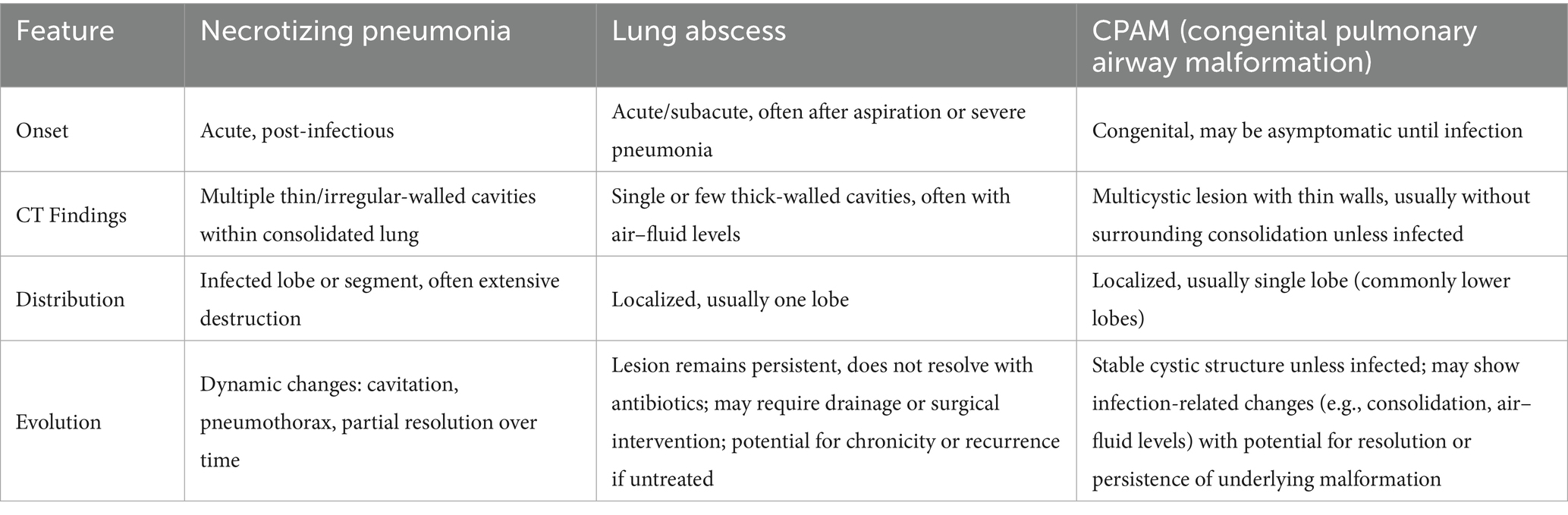 On day 15, chest CT revealed multiple irregularly shaped, thick-walled cavitary lesions in the lower and lingular lobes of the left lung, suggestive of pulmonary necrosis and lung abscess, with Congenital Pulmonary Airway Malformation (CPAM) not excluded (Table 1). Additional diagnoses included necrotizing pneumonia and possible lung abscess.