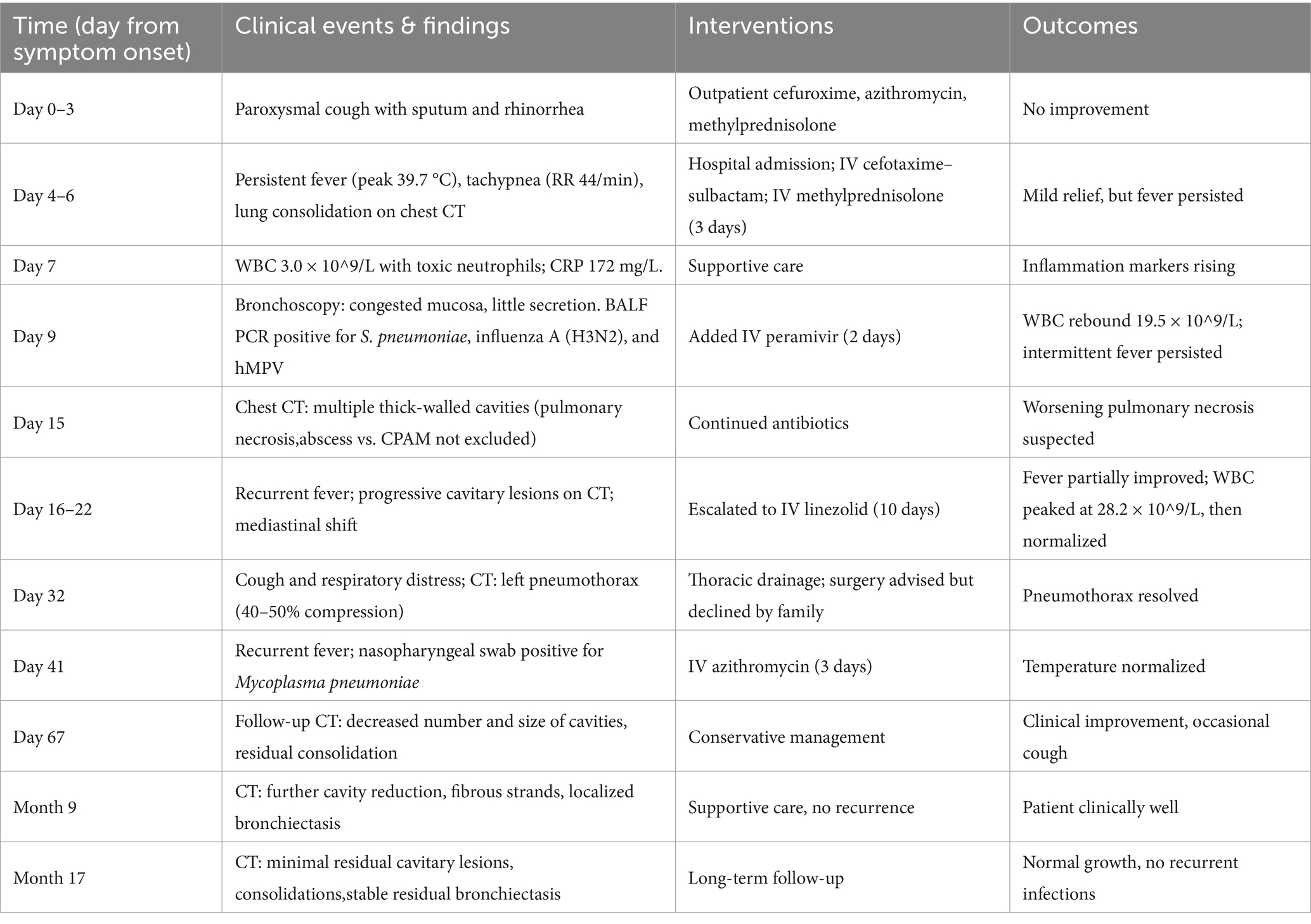 Imaging characteristics play a pivotal role in the diagnosis and monitoring of necrotizing pneumonia. Typical radiologic findings include lung consolidation with low-attenuation areas, solitary or multiple necrotic cavities, air- or fluid-containing cavitations (either thin-walled or lacking clear walls), fibrous strands, emphysema, pneumothorax or hydropneumothorax, and pleural thickening (17). In the present case, the child initially exhibited lung consolidation, which progressed to cavitary lesions by day 15—raising clinical suspicion of necrotizing pneumonia and necessitating differentiation from congenital pulmonary malformations. On day 42, the patient developed a pneumothorax; although surgical removal of necrotic tissue was advised, it was declined by the family. By day 67, cavitary lesions had improved markedly, and further regression was seen by month 9, though bronchiectasis had emerged. By month 17, only minimal residual cavitary lesions and consolidations persisted, along with localized bronchiectasis, without further improvement.