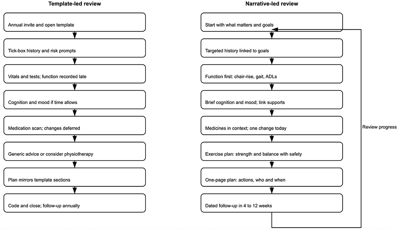 Figure 1. Comparative flows for frailty reviews—template-led pathway (left) vs. narrative-led pathway (right). The template-led pathway is linear and checklist-driven; the narrative-led pathway begins with “what matters,” links actions to goals, embeds an exercise prescription, and includes a follow-up feedback loop.
