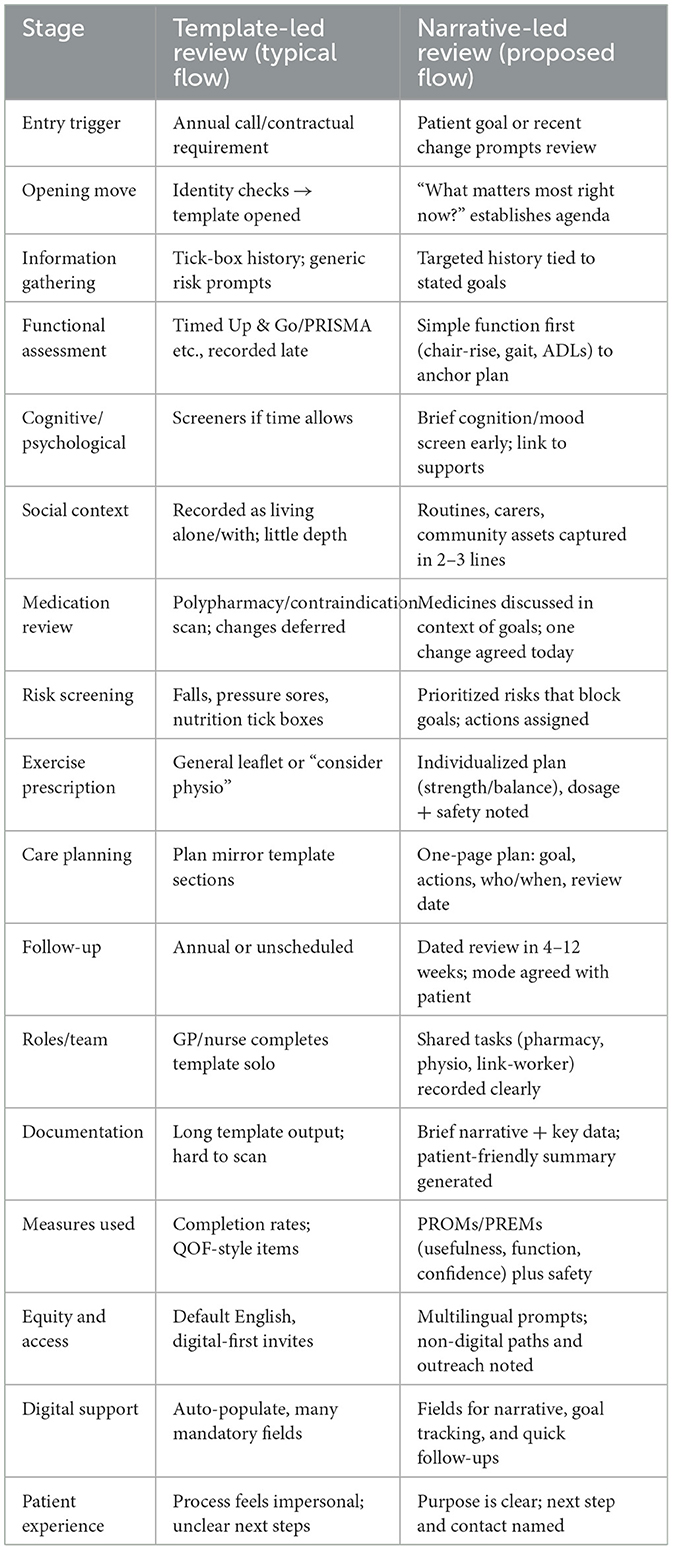 One of the simplest but most effective changes is reversing the order of the conversation itself. Too often, “what matters to me” appears after the discussion of falls, blood pressure, and medication—if it appears at all. Added after such items, the question risks seeming perfunctory or redundant. When placed first, it immediately makes the patient's voice not peripheral, but central. It also makes it easier for clinical information to be reinterpreted in the context of the patient's goals. For instance, dizziness may mean one thing for someone whose chief aim is to keep dancing and another for someone who values getting around the house on stairs. Presenting the review this way invites a more logical and empathic conversation flow. Beginning with goals allows clinical information to be interpreted through that lens. Table 1 illustrates a conceptual comparison between current template-led reviews and a reimagined, narrative-led model, highlighting key differences in structure, clinician role, and patient experience. Figure 1 provides a side-by-side flow of both pathways at a glance.