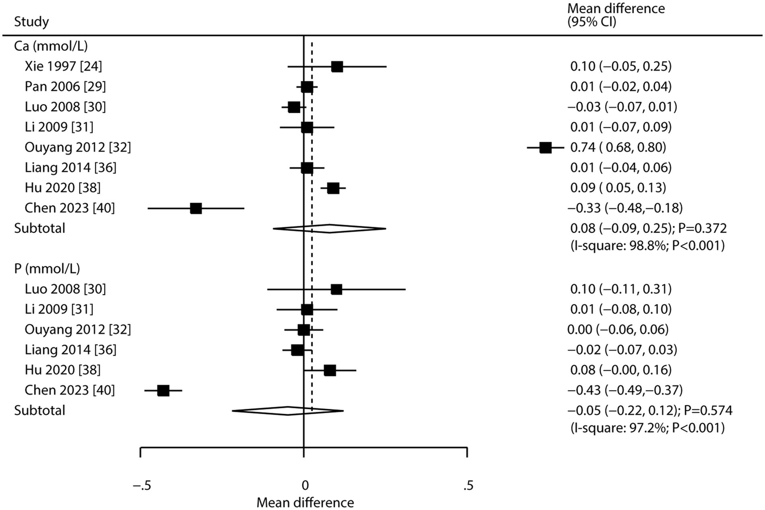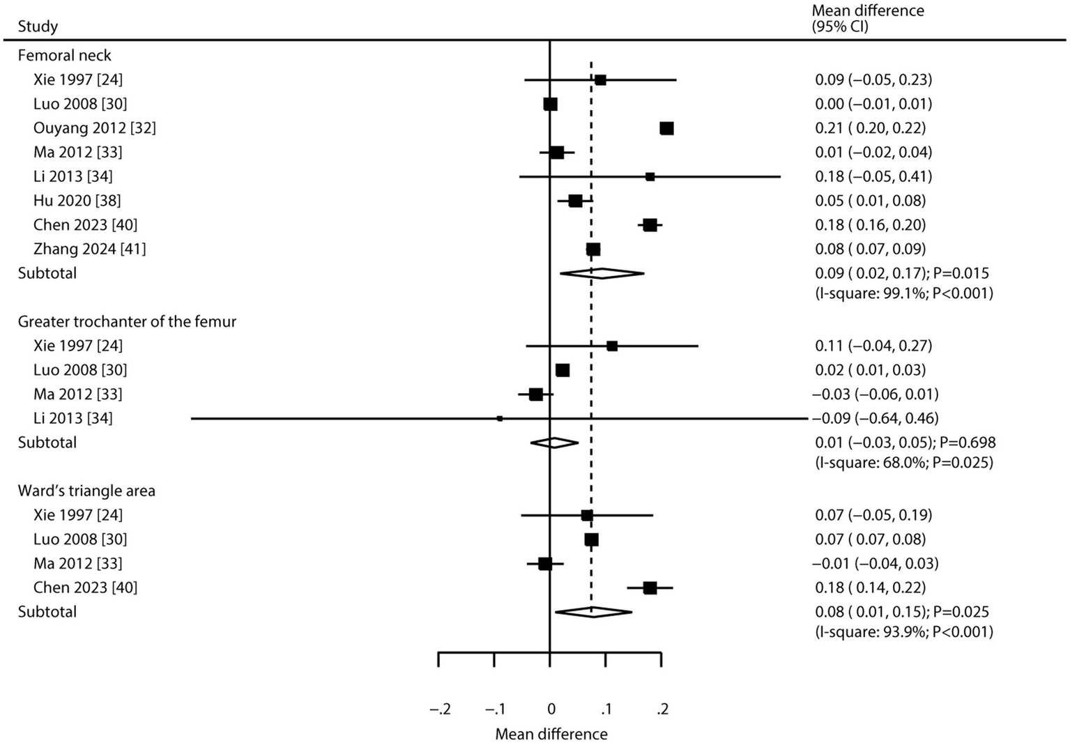 Eighteen RCTs involving a total of 1,816 patients with osteoporosis were included in the meta-analysis. CHM was associated with increased bone mineral density (BMD) at the lumbar spine (WMD: 0.09; 95% CI: 0.04 to 0.13; p < 0.001), femoral neck (WMD: 0.09; 95% CI: 0.02 to 0.17; p = 0.015), and Ward’s triangle area (WMD: 0.08; 95% CI: 0.01 to 0.15; p = 0.025). However, CHM showed no significant effect on BMD at the greater trochanter of the femur (WMD: 0.01; 95% CI: −0.03 to 0.05; p = 0.698). Additionally, CHM was not associated with changes in alkaline phosphatase (WMD: 0.98; 95% CI: −6.88 to 8.83; p = 0.808), serum calcium (WMD: 0.08; 95% CI: −0.09 to 0.25; p = 0.372), or serum phosphorus (WMD: -0.05; 95% CI: −0.22 to 0.12; p = 0.574).