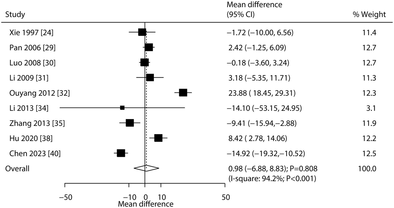 A systematic search of PubMed, Embase, Cochrane Library, CNKI, and Wanfang databases was conducted through March 2025 to identify eligible RCTs. The weighted mean difference (WMD) and 95% confidence intervals (CI) were used as effect estimates, with pooled analyses calculated using a random-effects model. Additional exploratory analyses included sensitivity and subgroup analyses.