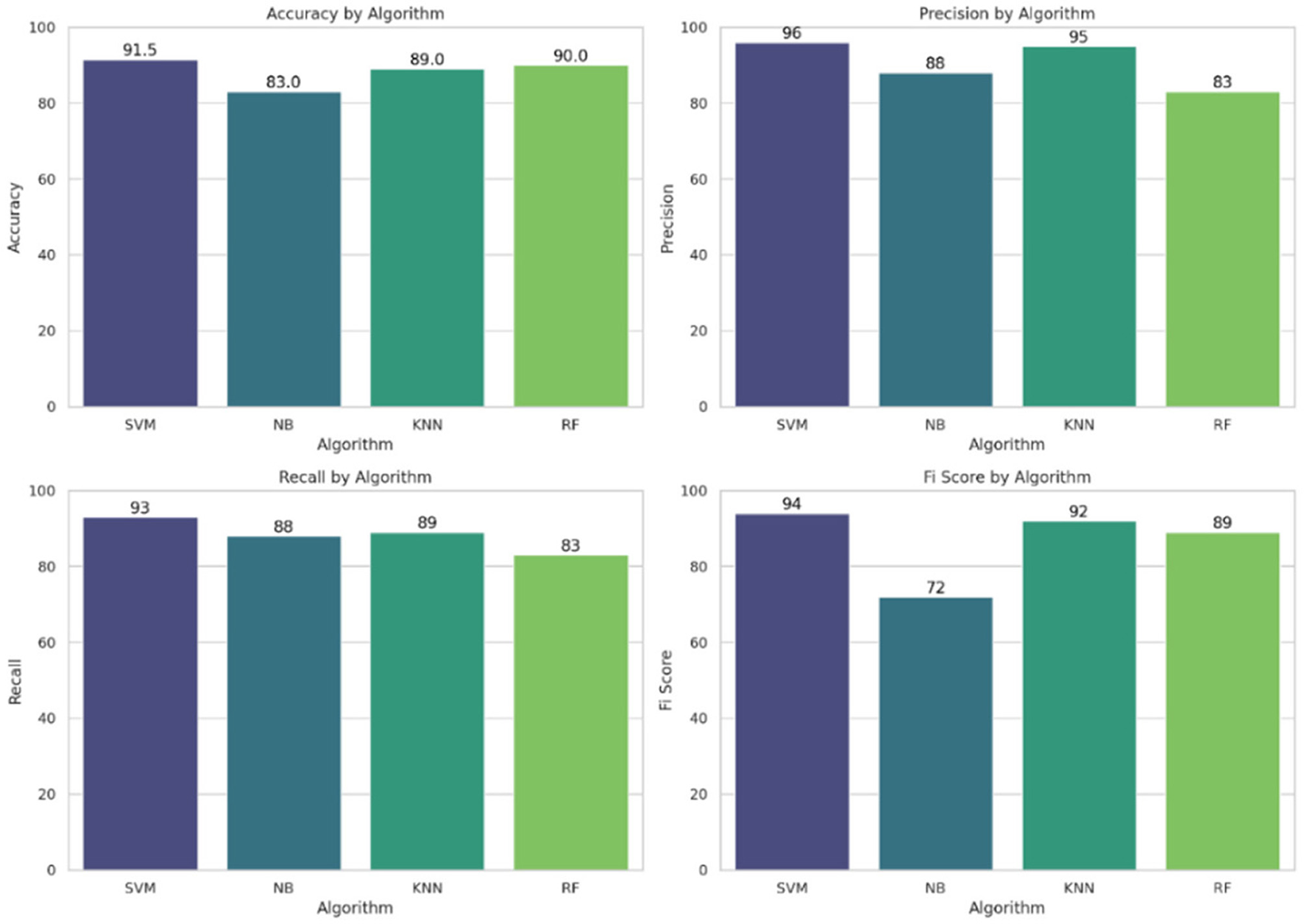 Among the evaluated models, SVM outperformed the others with an accuracy of 91.5%, followed by RF (90%), KNN (89%), and NB (83%). The study highlights the effectiveness of SVM in early diabetes prediction and demonstrates how model performance varies with algorithm selection.