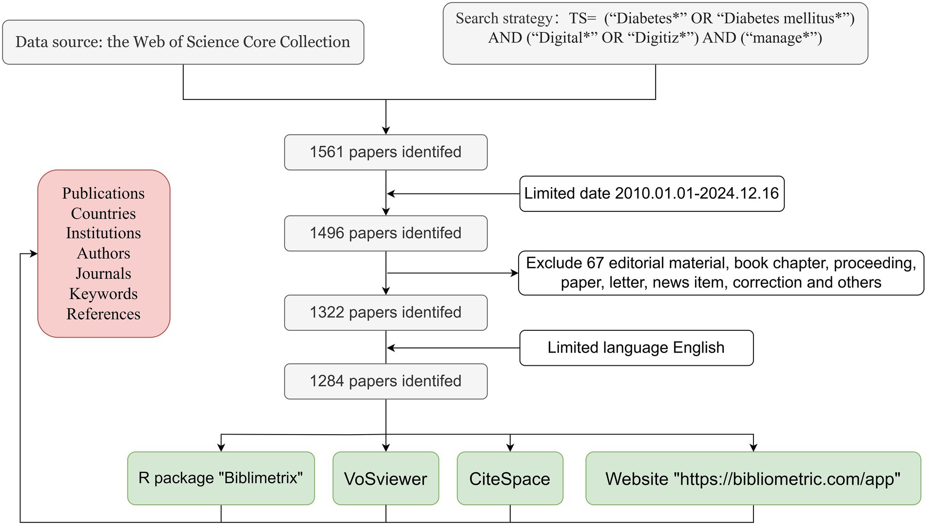 We conducted a comprehensive search on 16 December 2024, selecting all papers published between 1 January 2010 and 16 December 2024 from the Web of Science Core Collection (WOSCC). The search was performed using the following formula: TS = (“Diabetes*” OR “Diabetes mellitus*”) AND (“Digital*” OR “Digitiz*”) AND (“manage*”). Articles and reviews written in English were considered. The initial screening process yielded a total of 1,284 original articles in English, including 976 articles and 308 reviews, which were considered potential candidates for inclusion in the study. For more detailed information on the literature extraction process, please refer to Figure 1.