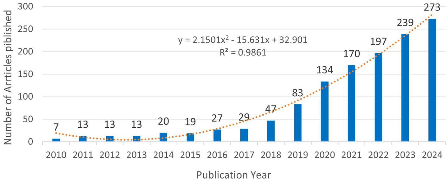 Figure 2. Trends in the number of publications on digital management of diabetes, 2010–2024. The equation y = 2.1501×2–15.631x + 32.901, where Y represents the yearly publication, and X represents the year. The coefficient of determination (R2) of the model was 0.9861.