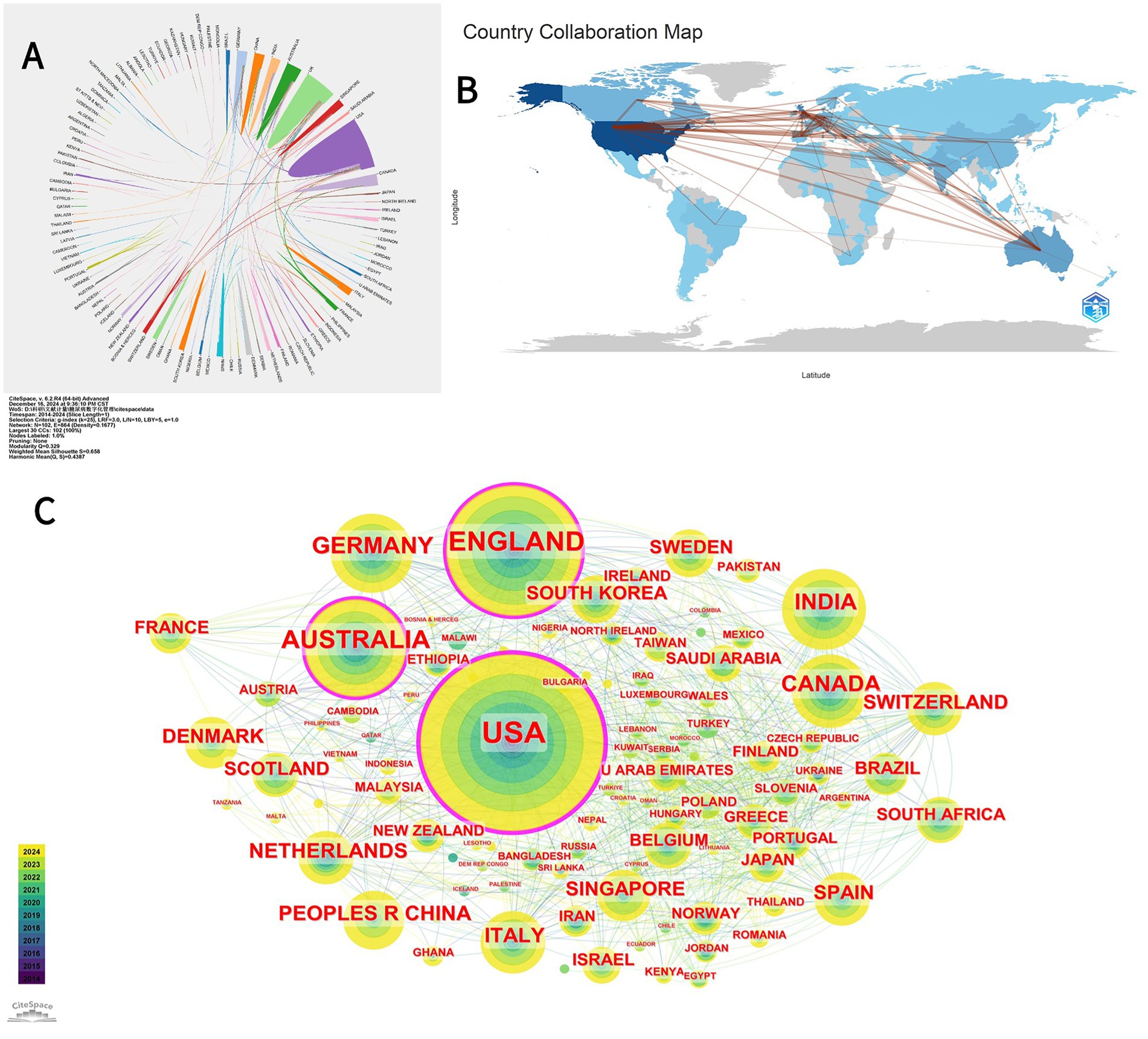 Figure 3. (A) A map illustrating bilateral cooperation networks among countries/regions regarding publications on diabetes digital management from 2010 to 2024. This map was generated using bibliometric analysis tools available at https://bibliometric.com/app; different color blocks represent various countries/regions, while color intensity indicates levels of collaboration between them. (B) Global collaborative map of countries/regions for publications on the digital management of diabetes from 2010 to 2024. The R package “bibliometrix” was employed for analyzing publication counts and collaborative activities by country/region. Darker blue shades indicate higher publication volumes per country/region; red lines denote collaborations between countries/regions, with thicker red lines representing stronger partnerships. (C) Collaboration map of countries/regions contributing to publications on the digital management of diabetes from 2010 to 2024. Generated using the bibliometric analysis software CiteSpace, each circular node represents a country/region; larger circles indicate a higher number of publications related to diabetes digital management in that specific area. The yellow and green segments denote different publication years (refer to the time color card in the bottom left corner for further details). The outermost purple circle identifies countries/regions with a centrality greater than 0.1, signifying those with significant influence in the field of diabetes digital management.