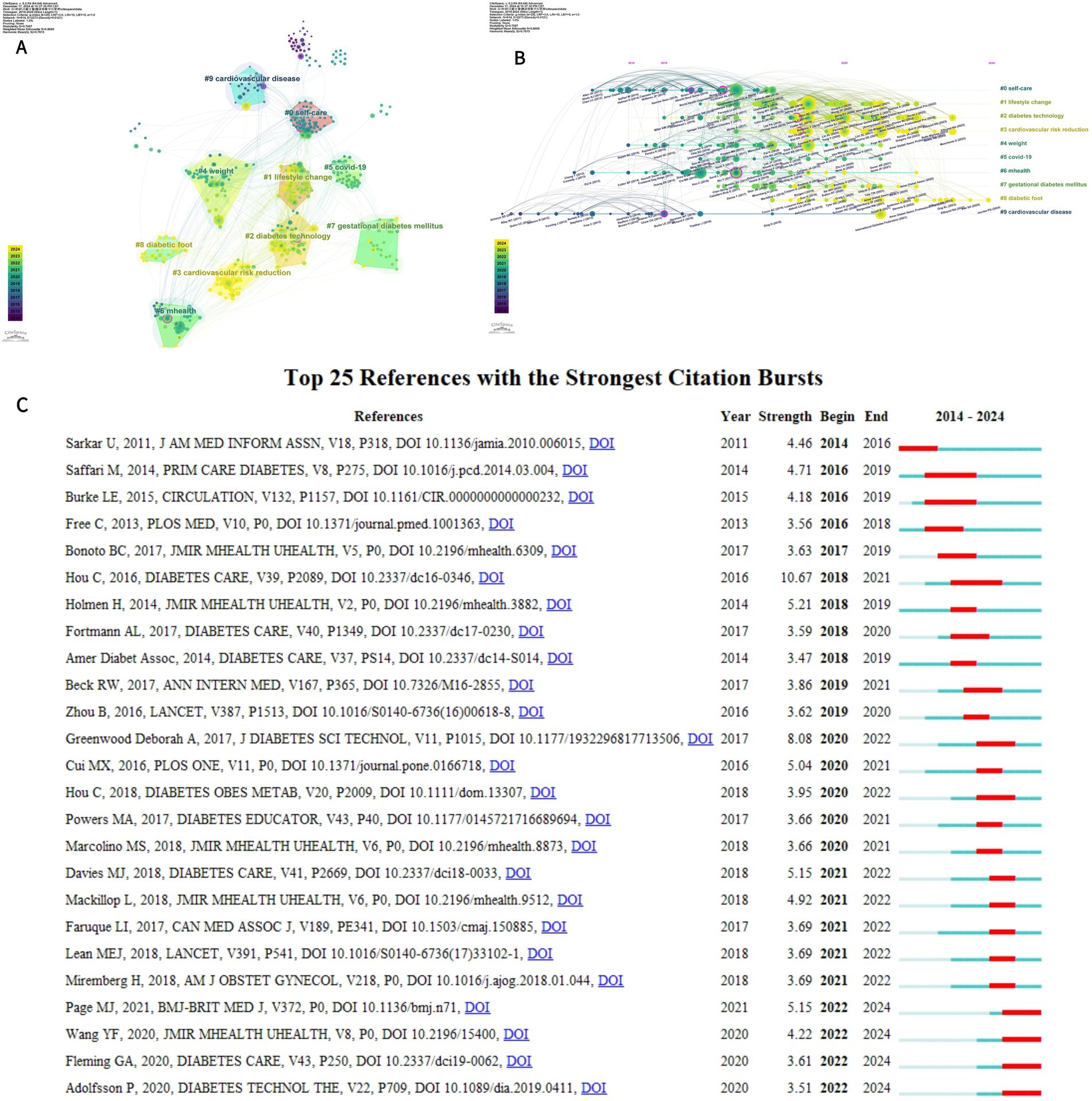 Figure 9. (A) Cluster analysis of co-cited literature related to digital management of diabetes visualized using CiteSpace (B) Timeline map of co-cited literature related to digital management of diabetes visualized using CiteSpace (C) Top 25 references of the 2010–2024 explosion.