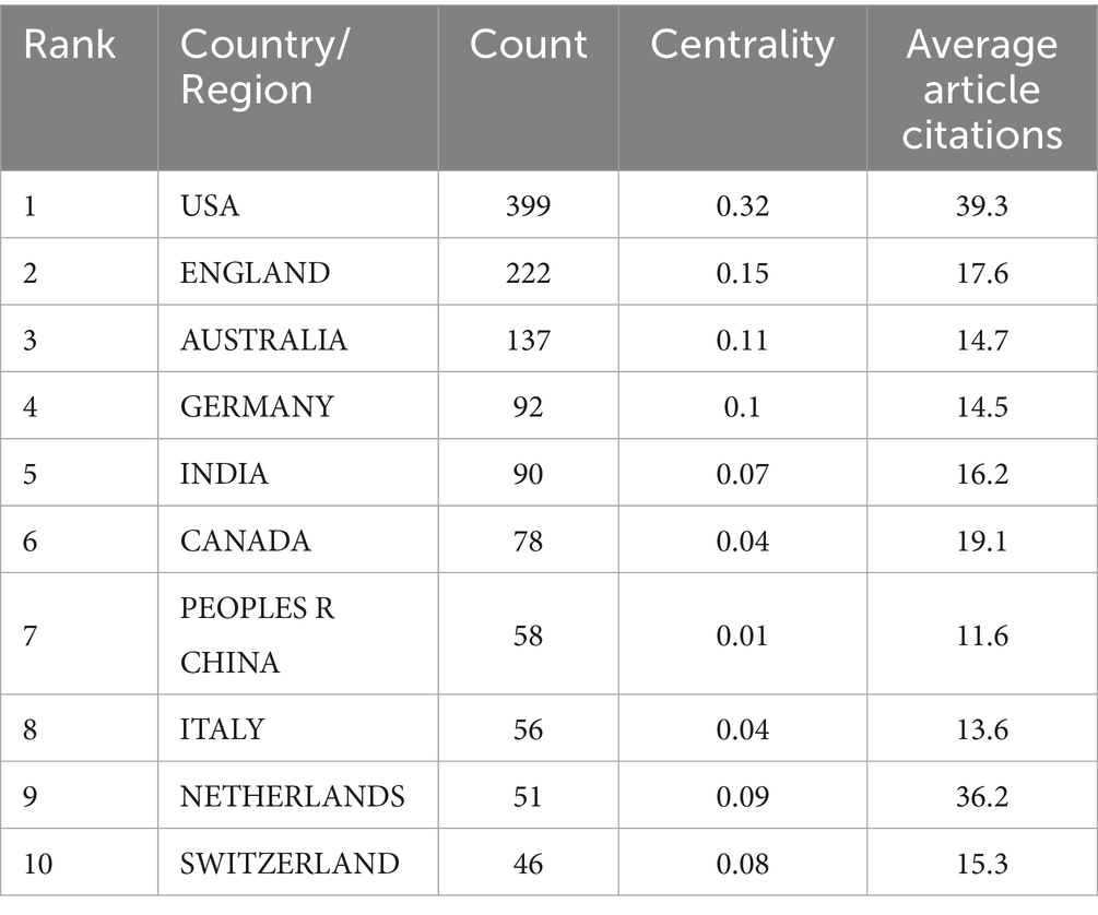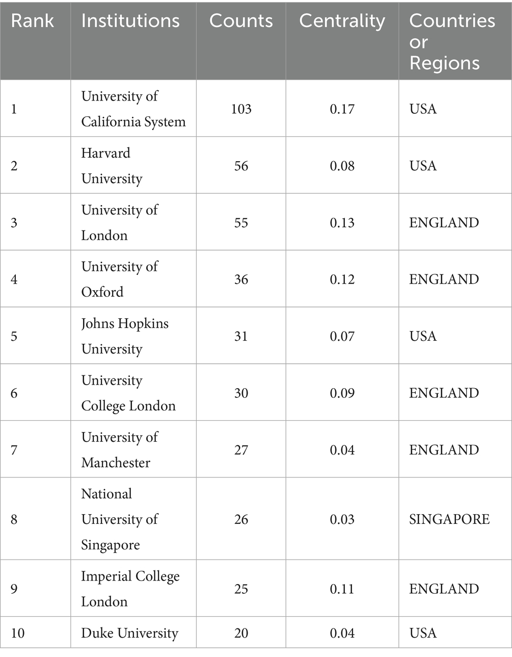Table 2 shows the top 10 most productive universities, with the University of California System, Harvard University, and, University of London being the top three universities with the highest number of published articles (103, 56, and 55, respectively). Notably that the University of California System is significantly more central than the other two universities (0.17), demonstrating its dominant influence in terms of publications. Five of the top 10 institutions are affiliated with the UK and four with the US.