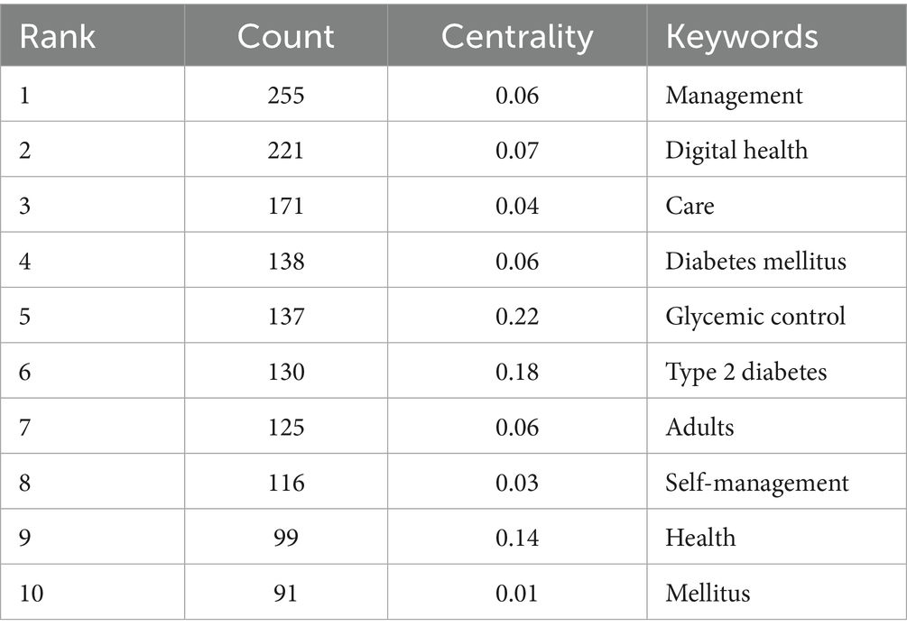 Table 4 presents the ten most prevalent keywords ranked by frequency. Notably, “management,” “digital health,” and “care” emerge as the foremost keywords, signifying their prominence in this research domain over the past decade. The centrality scores for “glycaemic control” and “type 2 diabetes” are the highest, at 0.22 and 0.18, respectively, indicating their extensive interconnections with numerous other keywords and their role as critical links among various research topics or concepts. These concepts occupy a central position within the overarching knowledge network.