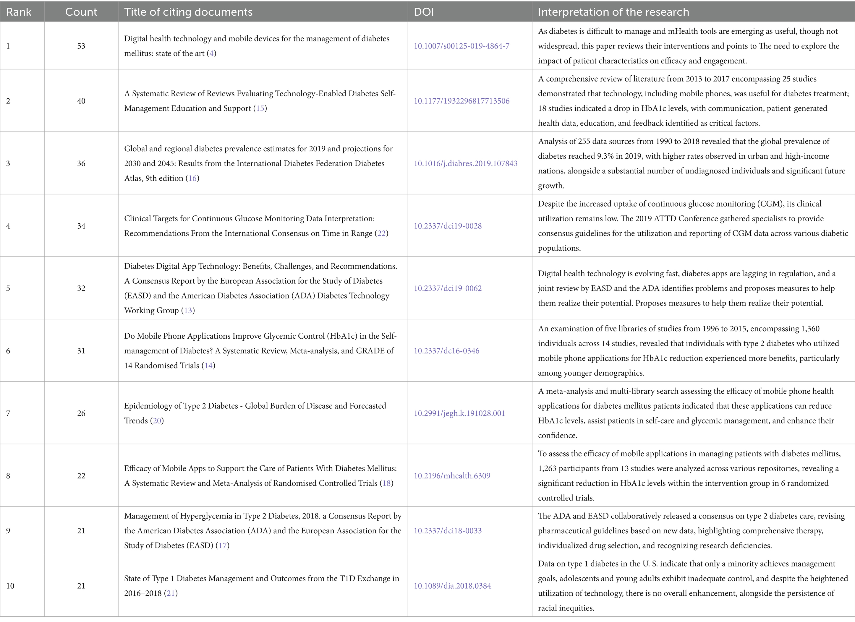 By analyzing the highly cited literature presented in Table 5, numerous studies have confirmed through randomized controlled trials and meta-analyses that mobile health technologies—such as diabetes management applications and continuous glucose monitoring (CGM)—can significantly reduce patients’ HbA1c levels. The mechanism underlying this effect is primarily based on real-time feedback from patient-generated data and remote interactions between healthcare providers and patients (4, 15–17). However, some studies reveal critical contradictions; despite a substantial increase in technology adoption (e.g., a threefold rise in CGM usage), the rate of blood glucose target attainment among adolescents and ethnic minorities remains stagnant. This stagnation underscores design flaws within digital tools regarding cultural appropriateness and support for health literacy (18, 19). International consensus documents further advocate for technical standardization, clarify the core clinical objectives of CGM, and establish an evidence-based evaluation framework for digital therapeutics (14, 20, 21). Additionally, the Global Burden of Disease study has quantified the prevalence of undiagnosed diabetes patients, providing an urgent impetus for regulatory innovation (18, 22). It is noteworthy that the “technology-efficacy disconnect” highlighted by T1D Exchange data (19) directly reflects the central challenge articulated by the joint statement from ADA/EASD—the lack of interoperability among medical systems impedes effective technology transfer (14). Collectively, these studies demonstrate that while the clinical value of digital diabetes management has been substantiated, its large-scale implementation necessitates urgent adaptations to personalized technology as well as comprehensive reconstruction of health service systems. The above analysis synthesizes key findings from Table 5 highly cited publications, highlighting major evidence trends and contradictions within the co-citation network.