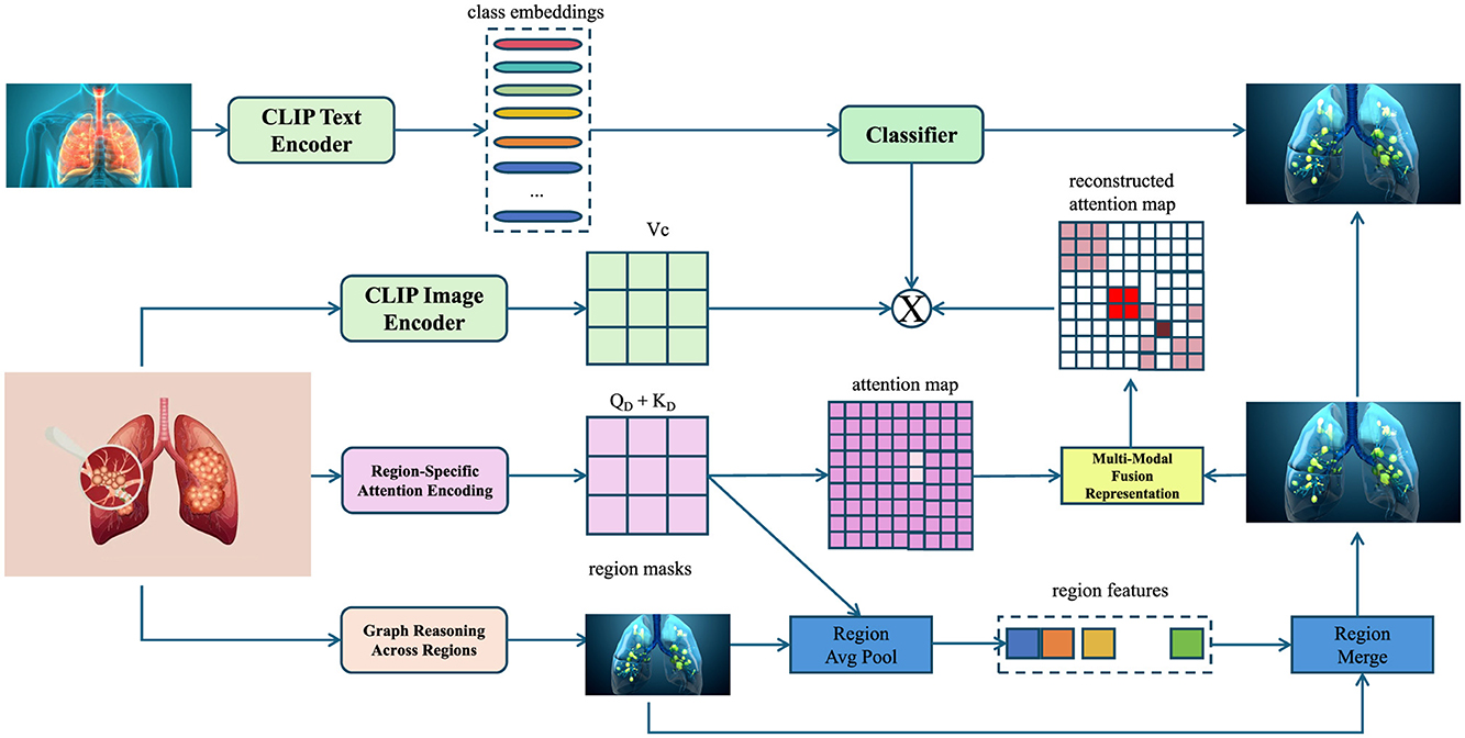 Figure 1. Schematic diagram of PulmoNet architecture for multi-modal lung disease analysis. The framework integrates CLIP-based text and image encoding with anatomically constrained region-specific attention, graph-based regional reasoning, and multi-modal feature fusion to enable accurate and interpretable lung disease classification. Region masks derived from anatomical priors guide the attention encoding process, while a graph attention network captures inter-region dependencies. Fused multi-modal features are subsequently used for final disease prediction.