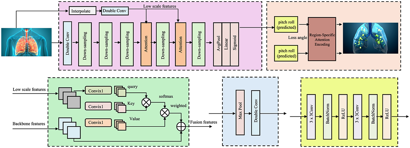 Figure 2. Schematic diagram of region-specific attention encoding. The framework extracts low-scale features from volumetric lung CT scans, performs anatomical partitioning with pitch and roll prediction, and utilizes gated attention to focus on relevant lung subregions. Multi-scale convolutional operations and attention mechanisms are applied before fusing features for final downstream reasoning. The design ensures anatomical interpretability and enhances spatially localized feature extraction for lung disease analysis.