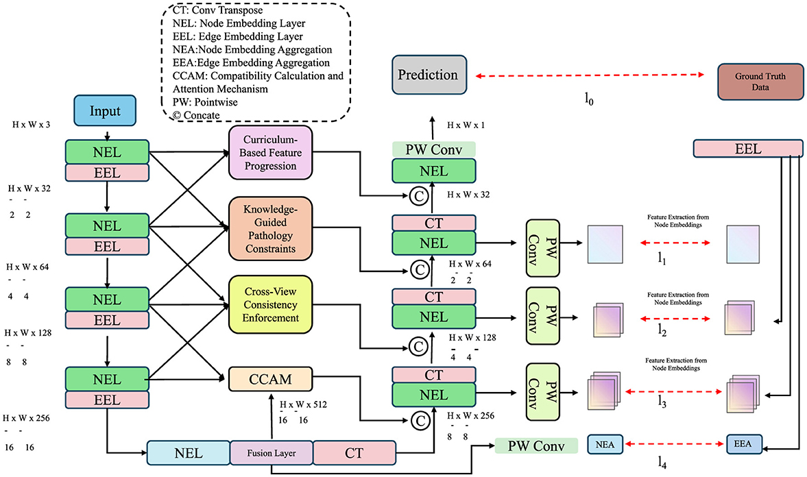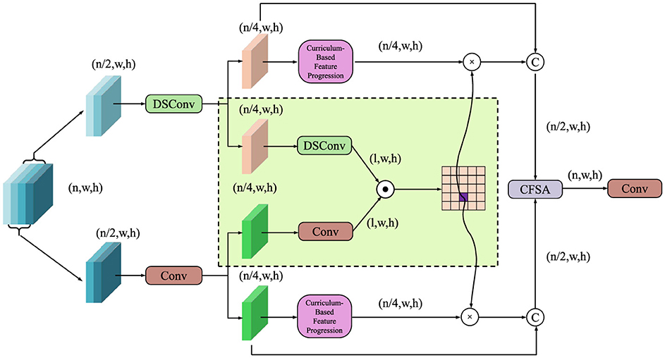 Figure 4. Schematic diagram of curriculum-based feature progression. The model progressively refines features through depthwise separable convolutions (DSConv), conventional convolutions, and curriculum-based modules. Feature fusion and cross-scale aggregation are performed via a Cross-Feature Self-Attention (CFSA) block, enhancing anatomical structure understanding, and enabling robust pathology reasoning.