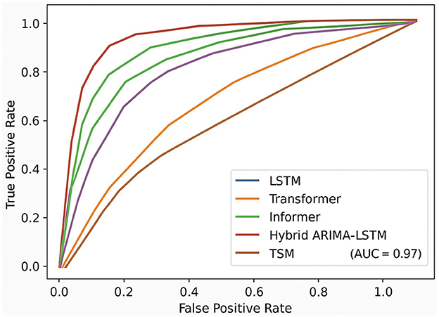 Figure 5 presents the ROC curves of all evaluated models on the MIMIC-III dataset. It is evident that the proposed TSM model (brown curve) consistently outperforms baseline methods across all threshold levels, achieving the highest Area Under the Curve (AUC = 0.907). This indicates superior sensitivity-specificity trade-offs compared to Transformer (AUC = 0.860), Informer (AUC = 0.880), Autoformer (AUC = 0.873), Hybrid ARIMA-LSTM (AUC = 0.868), and LSTM (AUC = 0.862). Notably, the traditional models such as LSTM and Hybrid ARIMA-LSTM demonstrate relatively steep but early saturating curves, which suggests a tendency toward early classification bias. In contrast, the TSM model maintains a well-balanced curve shape that adheres closer to the ideal top-left corner, reflecting its robustness in distinguishing between positive and negative pulmonary diagnostic outcomes. These results provide further evidence of the clinical applicability of our approach, especially in scenarios demanding high sensitivity and specificity.