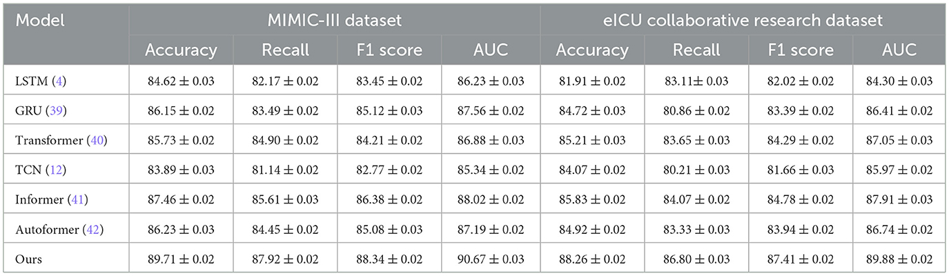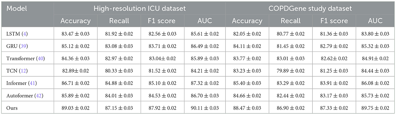 We conduct a comprehensive comparison between our proposed TSM model and six representative SOTA time series models across four benchmark datasets: MIMIC-III Dataset, eICU Collaborative Research Dataset, High-Resolution ICU Dataset, and COPDGene Study Dataset. The results are reported in Tables 1, 2, where we evaluate the models using Accuracy, Recall, F1 Score, and AUC. On the MIMIC-III Dataset, our model achieves the highest performance across all metrics with an Accuracy of 89.71, Recall of 87.92, F1 Score of 88.34, and AUC of 90.67. These results significantly outperform all baseline models including Informer and Autoformer, which previously held top scores. Notably, TSM surpasses Informer by 2.25 points in Accuracy and 2.65 points in AUC, demonstrating its strong ability to capture long-range dependencies and temporal patterns in pose data. The superior performance is consistent across both structured datasets like MIMIC-III Dataset and in-the-wild datasets like eICU Collaborative Research Dataset, indicating that our model generalizes well to varied human poses and background conditions.