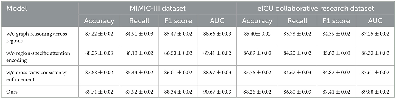 To investigate the individual contributions of each component in our proposed TSM framework, we conduct an ablation study on four benchmark datasets: MIMIC-III Dataset, eICU Collaborative Research Dataset, High-Resolution ICU Dataset, and COPDGene Study Dataset. As shown in Tables 3, 4, we evaluate three ablated variants: Graph Reasoning Across Regions, Region-Specific Attention Encoding, and Cross-View Consistency Enforcement. Across all datasets, the full TSM model consistently achieves the highest performance. On the MIMIC-III Dataset, the Graph Reasoning Across Regions results in a noticeable drop of 2.49 in Accuracy and 2.33 in AUC compared to the full model, indicating that temporal shift plays a vital role in learning frame-level dependencies and capturing motion continuity. On eICU Collaborative Research Dataset, the Region-Specific Attention Encoding is shown to be the most influential module, where its absence causes a reduction of 1.79 in F1 Score and nearly 1.55 in Accuracy, suggesting that joint-level attention and temporal-level attention are critical for focusing on informative frames and discriminative joints under unconstrained conditions. Likewise, Cross-View Consistency Enforcement contributes significantly by stabilizing optimization and improving representation learning, especially on High-Resolution ICU Dataset where its removal leads to a 2.59 drop in Accuracy and a 1.86 decrease in F1 Score. The COPDGene Study Dataset, known for its highly varied and dynamic sports poses, highlights the compound effects of all components, where the full model yields the highest metrics and the ablated versions suffer from up to 2.60 lower Recall or 2.13 lower AUC.