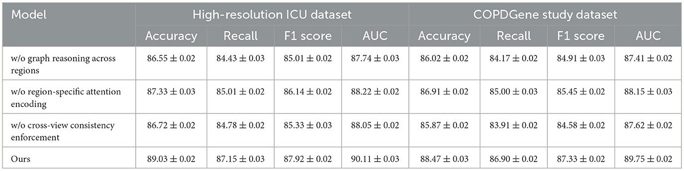 All experiments were implemented using the PyTorch framework and trained on NVIDIA A100 GPUs (40GB). For all datasets, including MIMIC-III, eICU Collaborative Research Dataset, High-Resolution ICU Dataset, and COPDGene Study, we followed consistent preprocessing and training protocols. Input imaging data (CT or X-ray) were resized to 384 × 288 for 3D models and normalized based on modality-specific intensity ranges. Non-imaging clinical variables were standardized using Z-score normalization. Multi-modal inputs—volumetric scans, tabular clinical data, and modality metadata—were jointly processed using our fusion architecture. For data splitting, we adopted an 80/10/10 (train/validation/test) split for large datasets and a 70/15/15 split for smaller datasets. All results are averaged across 5-fold cross-validation to ensure robustness. Validation sets were used for hyperparameter tuning and early stopping. We employed the Adam optimizer with an initial learning rate of 1 × 10−3, a weight decay of 1 × 10−5, and a learning rate scheduler that reduces the learning rate by a factor of 10 upon plateauing for 5 epochs. Batch size was set to 64. Training was conducted for 100 epochs on larger datasets and 50 epochs on smaller datasets. Standard data augmentation techniques were applied to imaging data, including random horizontal flipping, rotation (±30°), intensity jittering, and scaling (0.75 to 1.25). Anatomical segmentation masks were used during training to guide region-specific attention and graph construction. Evaluation metrics include Accuracy, Recall, F1 Score, and Area Under the ROC Curve (AUC). These metrics are widely accepted in clinical outcome prediction and classification tasks and ensure meaningful, interpretable comparisons across different models. All baseline methods were re-trained under identical conditions to ensure fairness. To further validate model generalizability, we conducted cross-dataset transfer evaluations and ablation studies isolating each module in our framework, such as PulmoNet, graph reasoning, and the APIL training strategy.