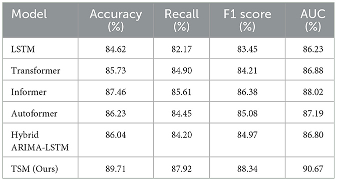 To the existing baselines, we further implemented the hybrid ARIMA-LSTM model proposed by Bhattacharyya et al. (2021) to provide a broader comparative view. This model integrates a classical statistical forecasting method (ARIMA) with LSTM to capture both linear and nonlinear dynamics in temporal health data. Table 5 shows that while the hybrid model performs competitively, it falls short of our TSM framework in accuracy (86.04% vs. 89.71%), recall, and AUC. This gap reflects the strength of TSM in modeling structured temporal dependencies and spatial anatomical relationships, which are not addressed in univariate hybrid approaches. Nonetheless, we acknowledge that the hybrid model remains effective in simpler time series settings and could be beneficial when domain-specific structural priors are unavailable.