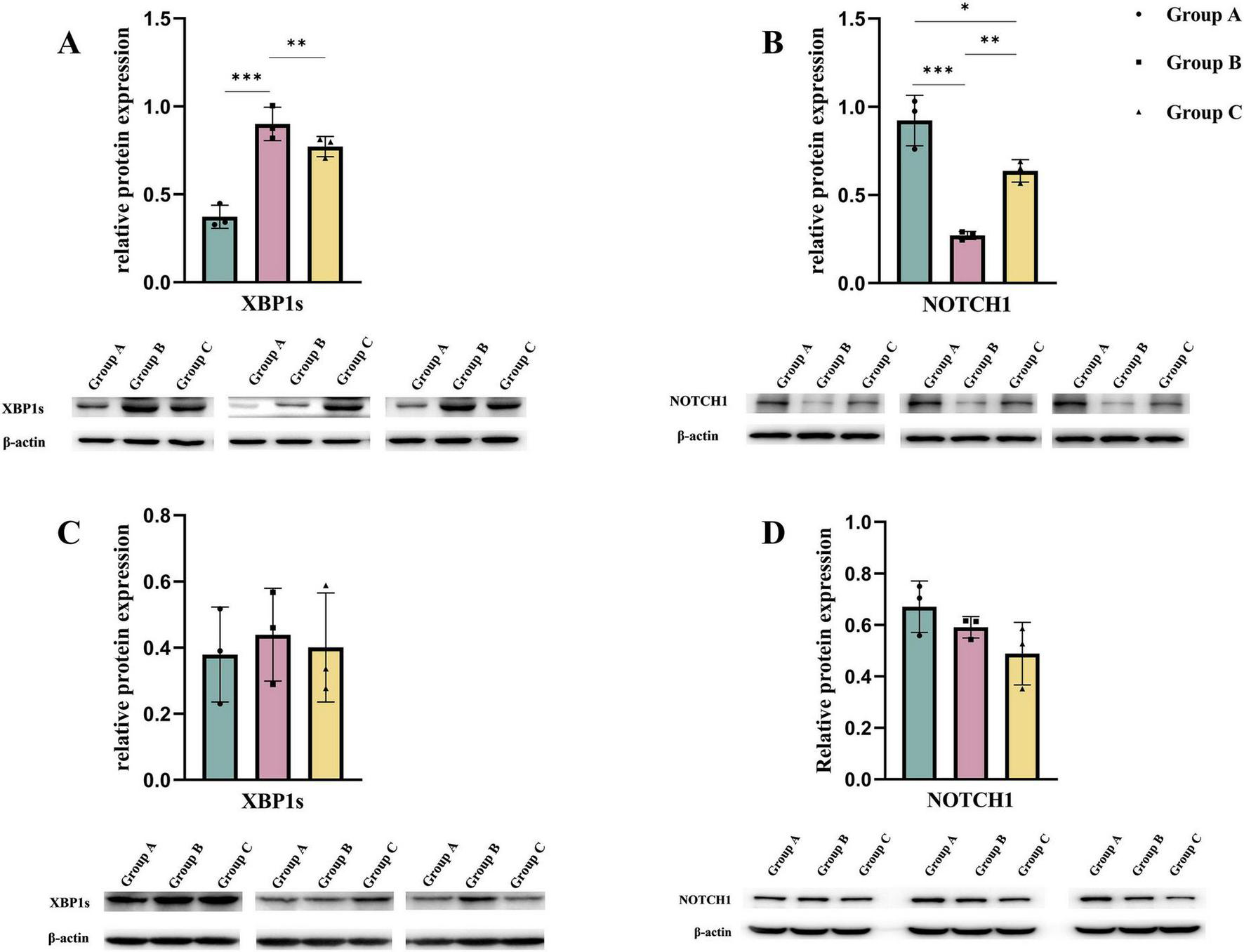 By culturing embryonic mouse cardiomyocytes from each study group in vitro, the expression of NOTCH1 in the cells was observed after blocking the IRE1α pathway. (A,B) Expression of XBP1s and NOTCH1 in embryonic mouse cardiomyocytes of each study group when the IRE1α pathway was not blocked. (C,D) Expression of XBP1s and NOTCH1 in each study group after co-culturing with the IRE1α inhibitor 4μ8c added to the cell culture medium. Data were displayed as mean ± sd. *p < 0.05, **p < 0.01, ***p < 0.001.