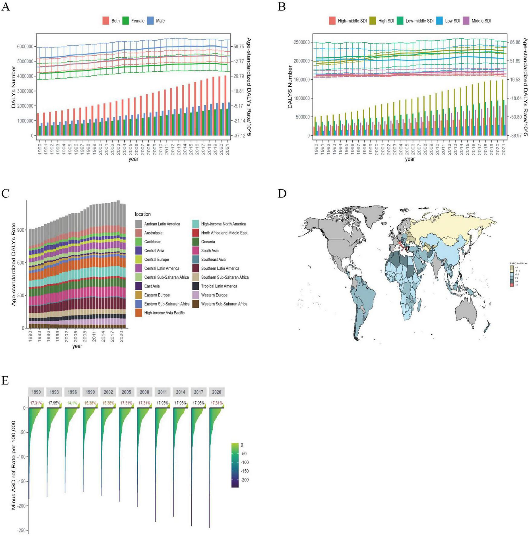 The DALYs burden of ILD in global, regional, and BRI countries from 1990 to 2021. (A) Global number of DALYs cases and ASDR; (B) global number of DALYs cases and ASDR by SDI regions; (C) global number of ASDR by 21 GBD regions; (D) EAPC of ILD DALYs in BRI countries (1990–2021); (E) the ASDR reference ranking of China among the BRI countries.