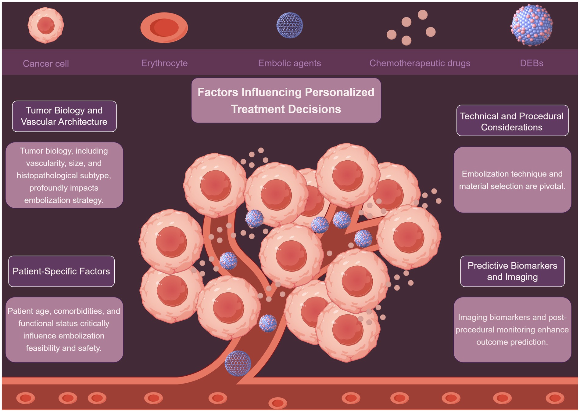 Personalized embolization strategies hinge on integrating tumor biology, patient physiology, technical precision, and predictive analytics. While consensus exists on factors like tumor vascularity and comorbidities, variability in study designs and outcome measures underscores the need for standardized protocols. Future research should prioritize prospective validation of biomarkers and comparative effectiveness studies to refine decision-making frameworks.