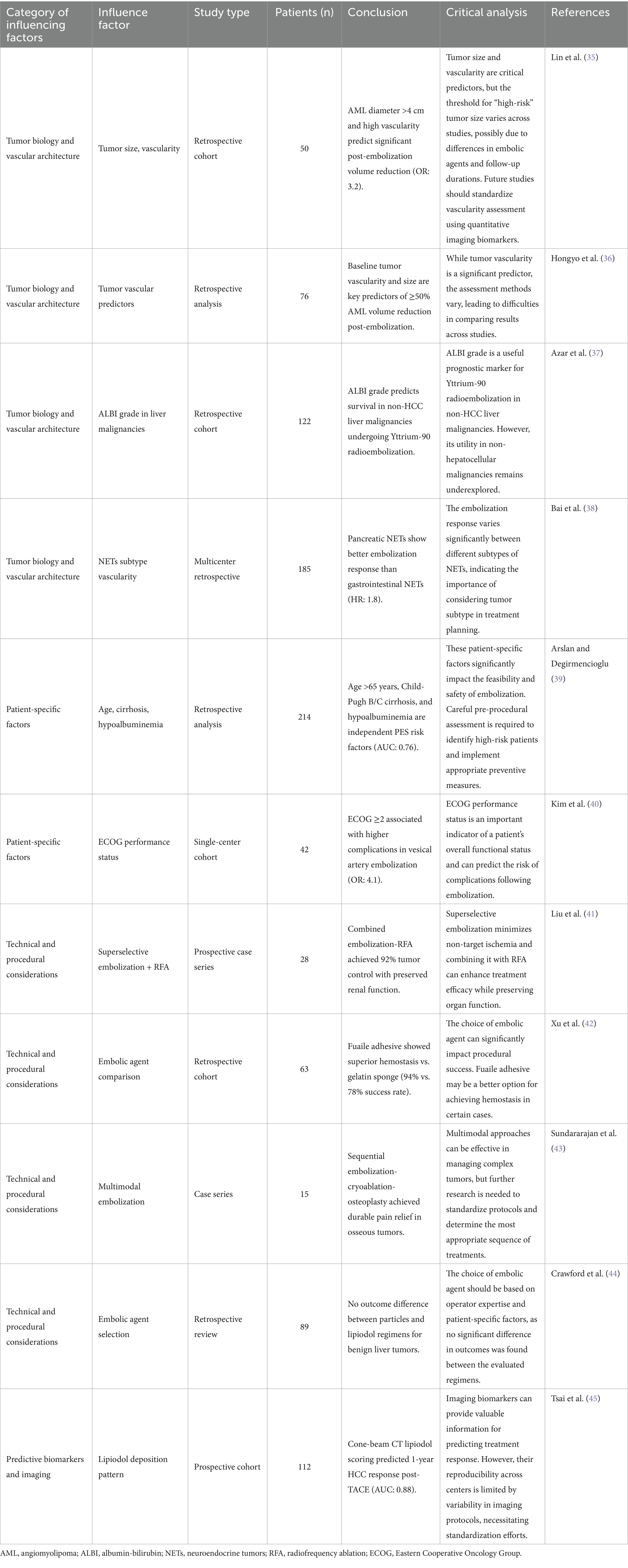 Patient-specific factors also significantly impact the feasibility and safety of embolization. Patient age, comorbidities, and functional status must be carefully evaluated. Arslan and Degirmencioglu (39) identified age >65 years, Child-Pugh B/C cirrhosis, and hypoalbuminemia as independent risk factors for post-embolization syndrome after TACE (AUC: 0.76). From a mechanistic perspective, hypoalbuminemia reflects reduced hepatic synthetic function and increased systemic inflammation, which may impair post-embolization recovery and increase susceptibility to infection or hepatic decompensation. Similarly, patients with ECOG ≥2 often have reduced systemic reserve, limiting their ability to tolerate procedural stress or post-embolization inflammation. Similarly, Kim et al. (40) reported higher complication rates in bladder cancer patients with ECOG ≥2 undergoing superselective vesical artery embolization (OR: 4.1, p < 0.001). Conversely, Hongyo et al. (36) emphasized that renal function preservation in AML patients favored selective embolization over surgery, particularly for those with chronic kidney disease (eGFR <60 mL/min/1.73 m2). The heterogeneity in comorbidity assessment complicates cross-study comparisons. Notably, while albumin-bilirubin (ALBI) grade predicts Yttrium-90 radioembolization survival in metastatic liver tumors, its utility in non-hepatocellular malignancies remains underexplored.
