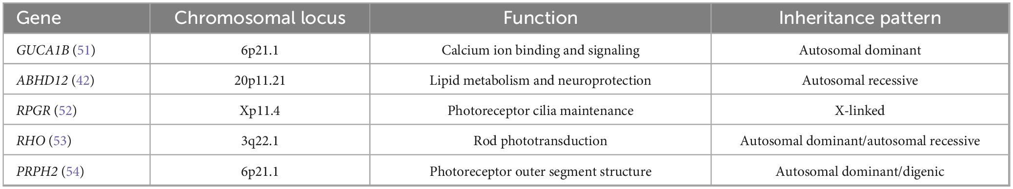 3. Daiger S, Sullivan L, Bowne S. Genes and mutations causing retinitis pigmentosa. Clin Genet. (2013) 84:132–41. doi: 10.1111/cge.12203