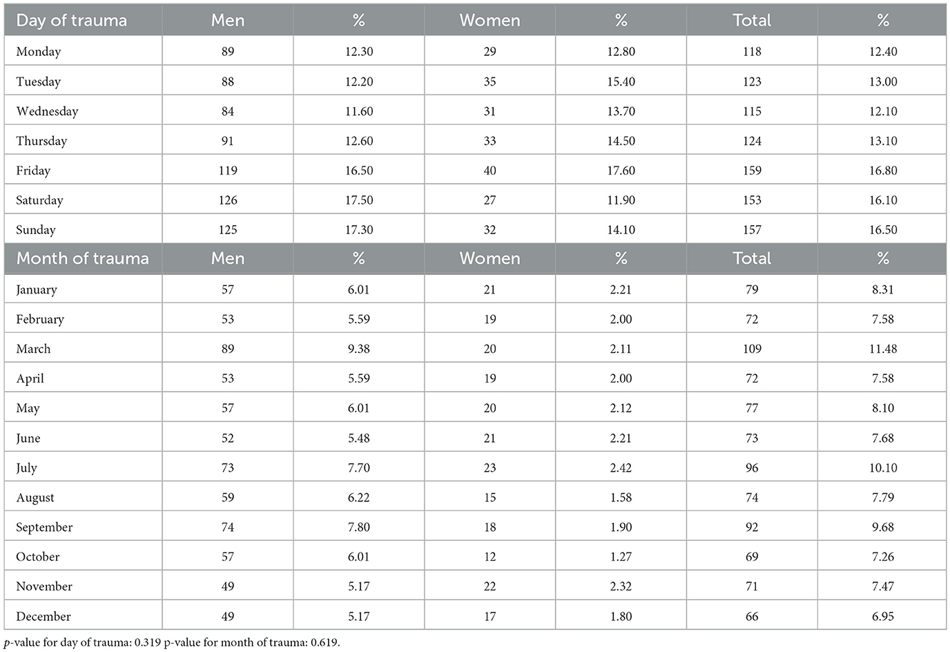 Regarding the timing of accidents, the distribution was not similar, with a higher percentage of accidents occurring during the weekend (p = 0.008) and during the months of March, July, and September (p = 0.015). This distribution regarding the timing of accidents was consistent for both genders, with no statistically significant differences observed, as shown in Table 1.
