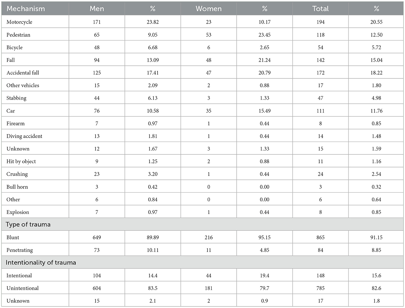 One aspect highlighted in this study is the differential distribution of trauma mechanisms according to biological sex. While men are primarily involved in traffic accidents and falls, women present a higher proportion of intentional traumas related to self-harm. This point coincides with previous studies that have identified that women are more likely to suffer injuries as passengers in traffic accidents or as a consequence of suicide attempts (47–49). Other studies like Teterina's indicate that men have more diagnoses associated with high-risk activities and occupational accidents, and women have more diagnoses related to partner violence and physical abuse (29). Findings from the Japan Trauma Data Bank highlighted that men generally experience more severe injuries compared to women, which may be attributed to a higher prevalence of high-impact traumas and alcohol intoxication among male patients. In that study, it was found that, while falls are the leading cause of TBI among older adults, older women were more frequently affected by falls from ground level, while falls from greater heights were more common in older men (18). The epidemiology of TBI has shown changing patterns over the years. For example, while high-speed traffic accidents have decreased due to better road conditions and vehicle safety features, population aging presents new challenges related to TBI risk (18). Current data indicate that older adults are increasingly vulnerable to falls, which are a significant factor in TBI incidence in this demographic group.