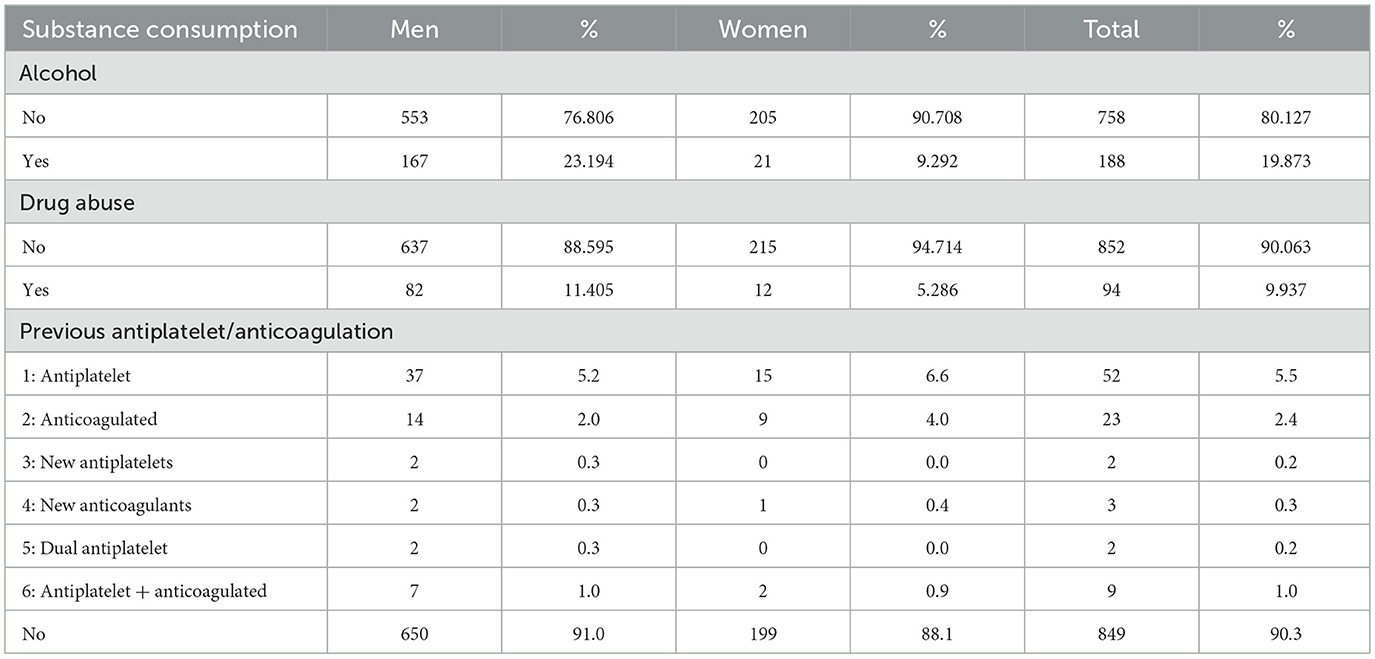 Regarding substance use in the context of TBI, a higher prevalence of alcohol and drug use has been identified in men (23.19% and 11.40%, respectively) compared to women (9.29% and 5.2%, respectively). Previous research has pointed out that alcohol consumption before trauma can negatively influence evolution and the severity of sequelae (65–67). Additionally, the literature suggests that substance use may increase during the recovery period, affecting long-term quality of life (23, 67). We also found a higher proportion of women with chronic psychotropic use compared to men (9.25% vs. 5.68%). Studies like Jakob's indicate that stimulant use may be related to prolonged hospital stays (68), while other works have described an increase in psychotropic use after TBI recovery, linked to symptoms of post-traumatic stress (69, 70).