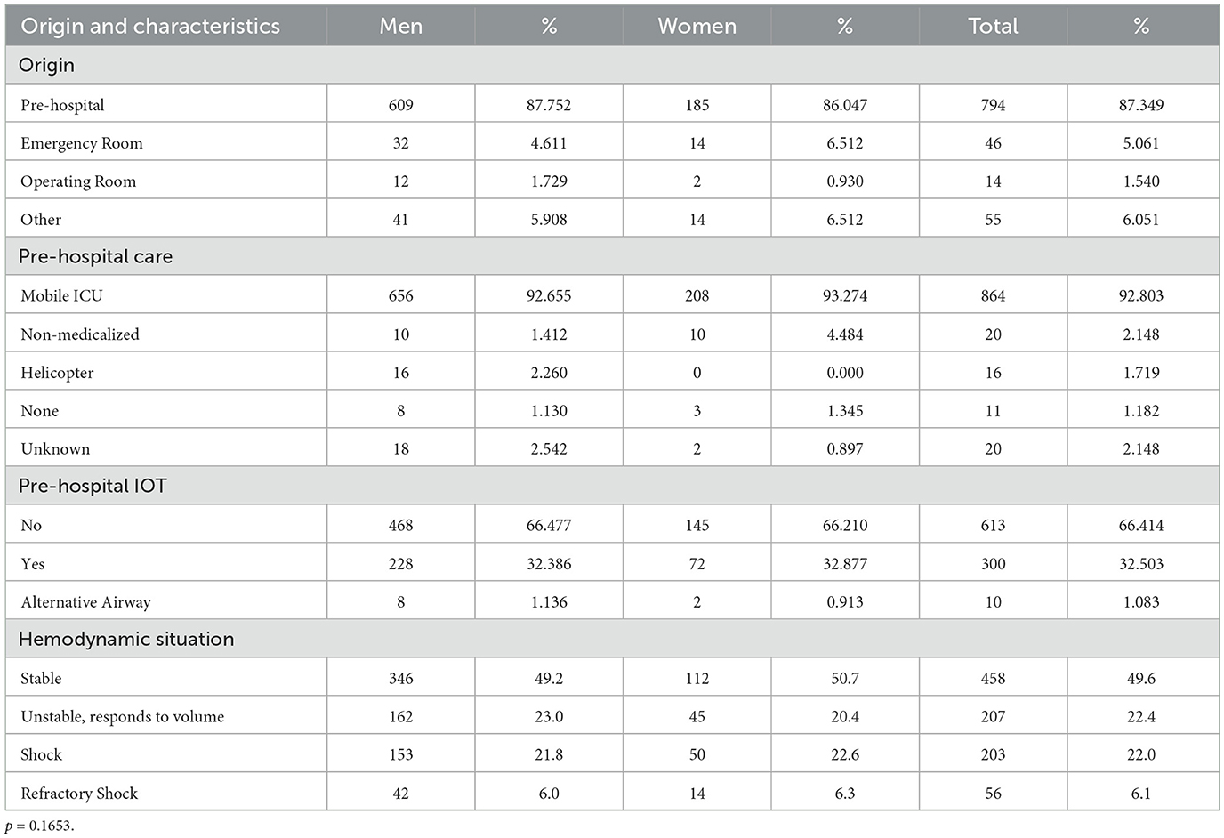 Regarding origin, the highest percentage of patients are admitted to the unit directly through pre-hospital care (87.35%), with 92.80% using mobile ICU services. Despite this, 66.41% did not require endotracheal intubation. We found statistically significant differences based on gender regarding the type of pre-hospital care (p = 0.005). About 50.43% presented with instability or shock at varying levels. Table 4 presents information on the origin and characteristics of patients upon arrival at the hospital.