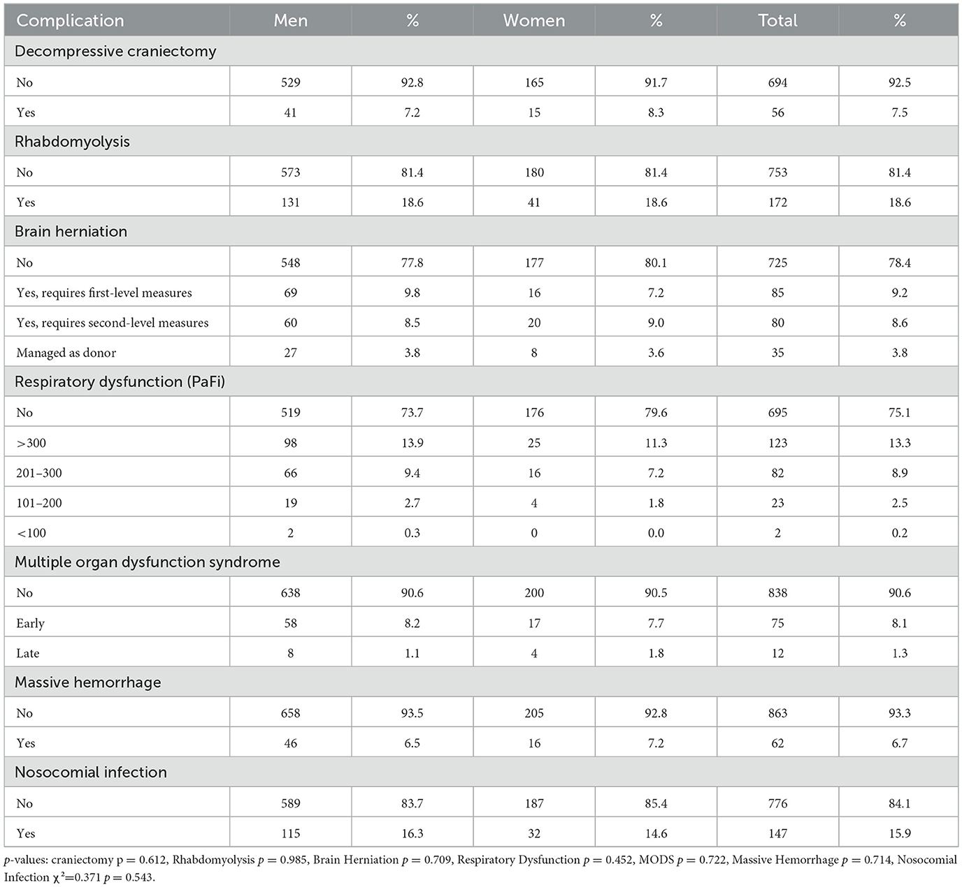 Extracranial complications in traumatic brain injury (TBI) patients admitted to the ICU are frequent and affect multiple systems, significantly contributing to morbidity and mortality (19, 22, 80, 81). In our study, no statistically significant differences were found in the occurrence of complications between sexes. Among the complications in the literature, coagulopathies, hemorrhages, thromboembolisms, and infections, such as ventilation-associated pneumonia, as well as iatrogenic complications, are included (19, 22). Although factors such as age, frailty, and Glasgow Coma Scale (GCS) score influence outcomes more than sex, differences between men and women remain relevant. Men present a greater predisposition to coagulopathies, while women show a higher incidence of urogenital infections, especially in cases of isolated TBI (22, 27). Some studies indicate that women have worse outcomes after mild or moderate TBI, although they may recover better in severe cases due to hormonal and immunological factors {27, 29, 54, 79}. Additionally, older men present more neurological and systemic complications, with higher mortality in old age (27, 29). These differences reinforce the need for sex-sensitive clinical care and future research that clearly distinguishes between the impact of biological sex and gender to optimize treatments (29).