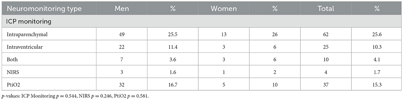 Table 6 shows the use of neuromonitoring (monitoring of ICP, jugular saturation, NIRS, and PtiO2), indicated only in individuals with a Glasgow score ≤ 8 (25.7% of the study population: 242 people, 192 men and 50 women). No statistically significant differences were found in the use of neuromonitoring systems between men and women. The average number of days of ICP use was 1.04 ± 3.54 (1.17 ± 3.88 in men and 0.62 ± 2.02 in women), with no statistically significant differences found (p=0.214).
