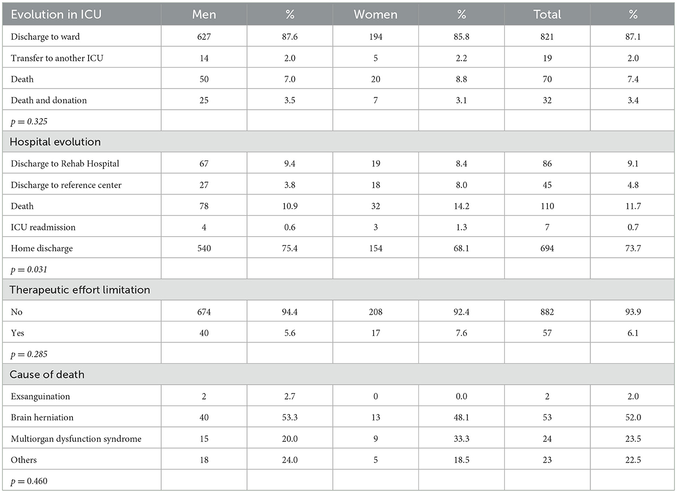 Table 7 presents the evolution of the patients. No significant differences were found between genders regarding their evolution in the ICU, with the majority in both cases being discharged to the ward as the patients' destination. Mortality was higher in women (14.2%), with the main causes of death being brain herniation and MODS, also without statistically significant differences between sexes. We found statistically significant differences only in terms of hospital evolution.