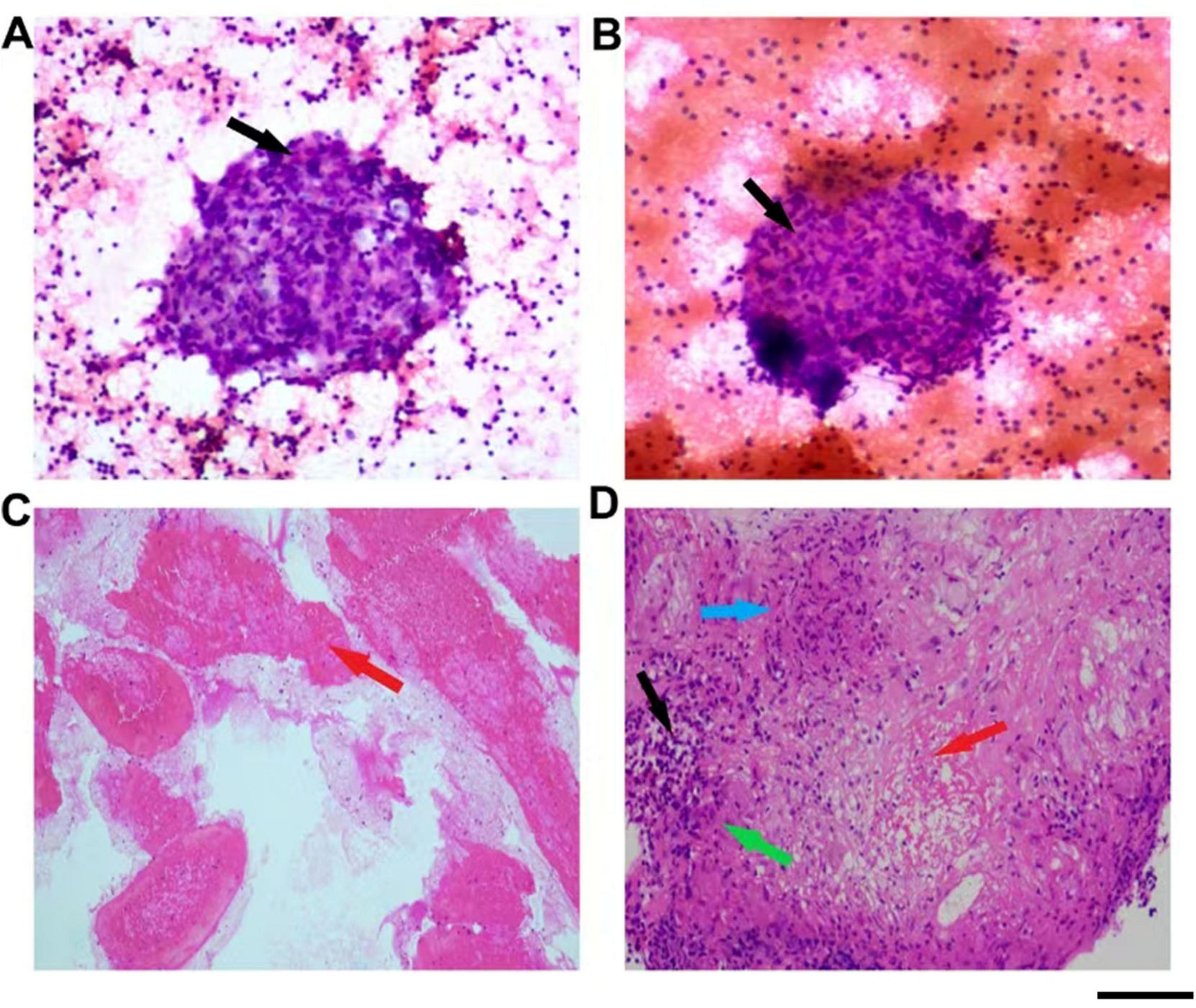 Figure 2. Pathological examination findings. (A) Pathological features of the axillary lymph node fine needle aspiration. (B) Pathological features of the cervical lymph node fine needle aspiration. (C) Pathological features of pulmonary lymph node fine needle aspiration. (D) Pathological features of the splenic fine needle aspiration. The black arrow indicates mononuclear macrophages, the red arrow indicates necrotic tissue, the green arrow indicates epithelioid cells, and the blue arrow indicates multinucleated giant cells. Scale bar = 100 μm.