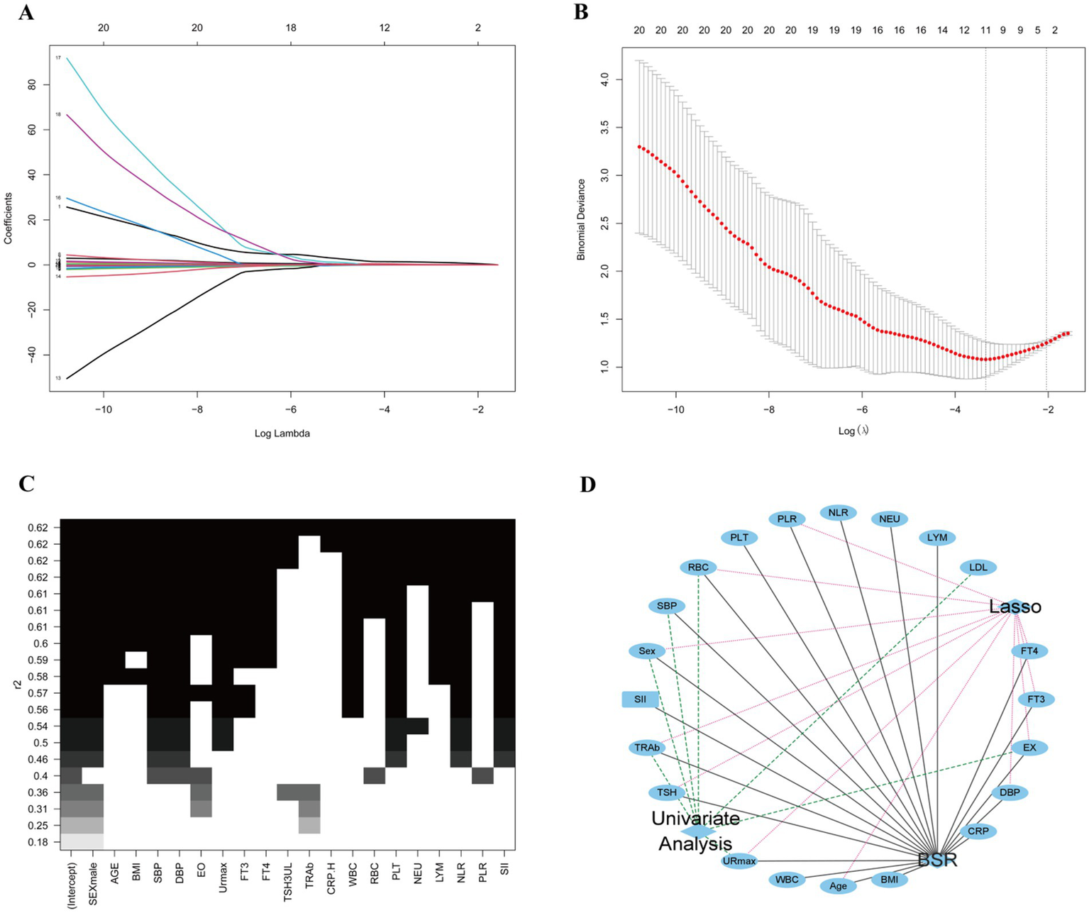 The combined application of BSR and LASSO identified sex, age, DBP, EX, URmax, FT3, FT4, TSH, TRAb, RBC, and PLR as significant predictors (Figures 3A–C). Five predictive models were constructed: