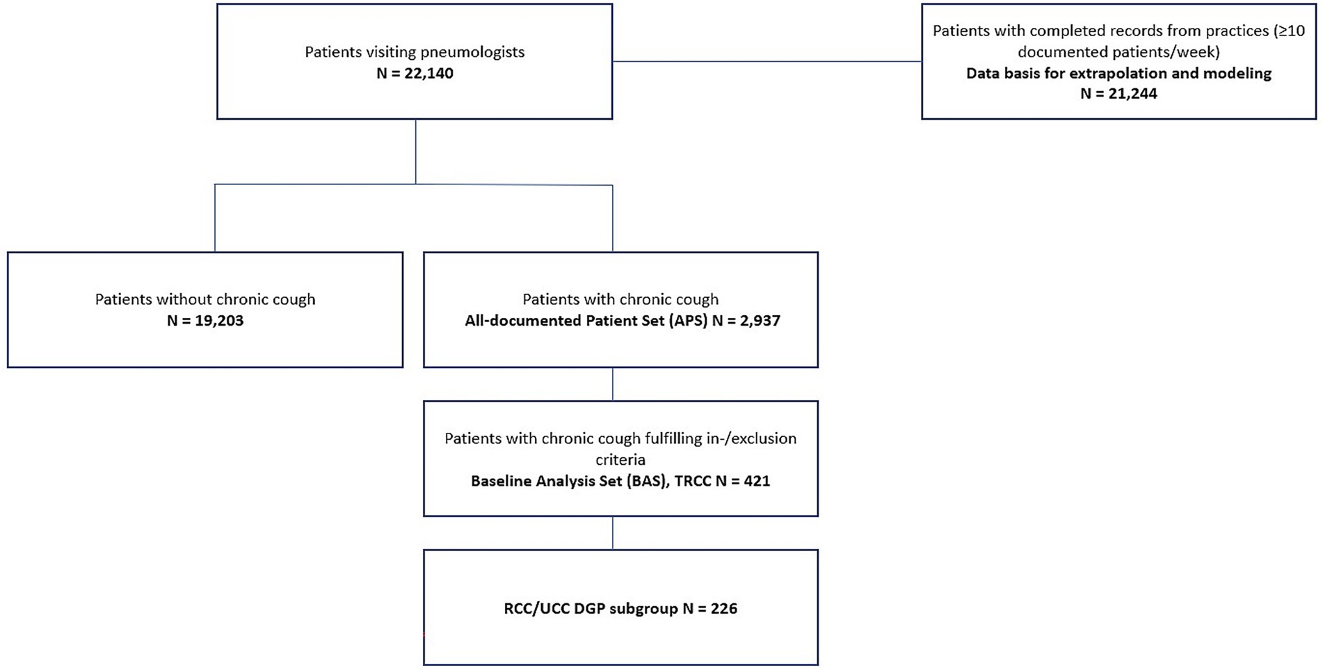 Figure 1. Patient disposition. The All-documented Patient Set (APS) consists of all patients with chronic cough documented by the participating sites (n = 2,937). The Baseline Analysis Set (BAS) consists of all patients of the APS with established specialist’s diagnosis of TRCC, RCC or UCC and signed written informed consent for the patient study and fulfilled the inclusion and exclusion criteria (n = 421). For quality assurance purposes, a number of weekly data were rejected and data were not used for prevalence calculations. This results in the Extrapolation Analysis Set (EAS), which consists of all data with complete documentation and weekly data of sites with at least 10 patients/week (n = 21,244).